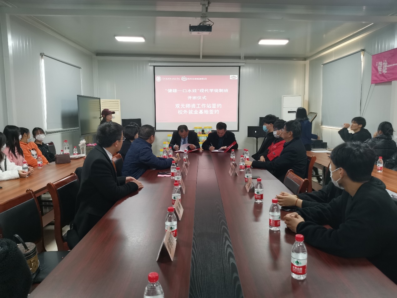 在“健雄-口水娃”现代学徒制班开班仪式上,口水娃食品有限公司捐赠学生奖学金2万元;校企双方签署了《合作建设健雄“双元”师资培养工作站协议》、《毕业生就业基地协议》;