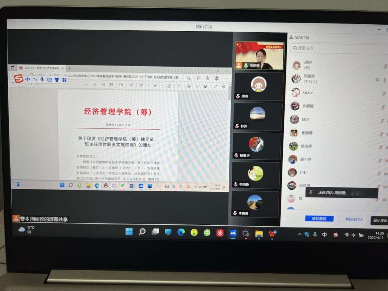 4月13日下午,经济管理学院(筹)举行2022年春学期第4次全体教职工政治学习。因疫情防控要求,学习以线上会议形式开展。本次学习活动由教职工政治学习、全体班主任会议和全体党员会议组成。