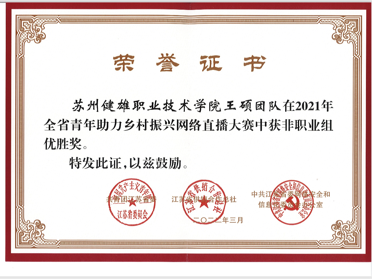 为进一步提升学生网络直播技能和实践运用能力,助力乡村振兴,充分展现服务乡村振兴的青年力量,苏州健雄职业技术学院经济管理学院精心组织筹备,参加了由共青团江苏省委、江苏省供销合作总社、江苏省委网信办共同举办的2021江苏省青年助力乡村振兴网络直播大赛。