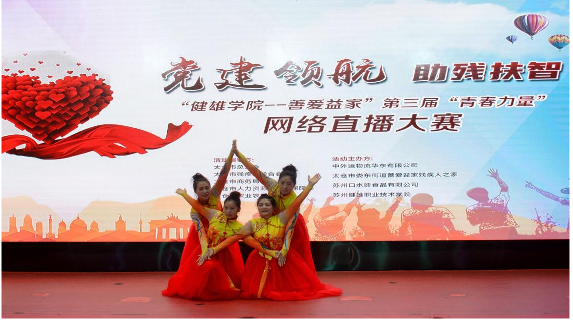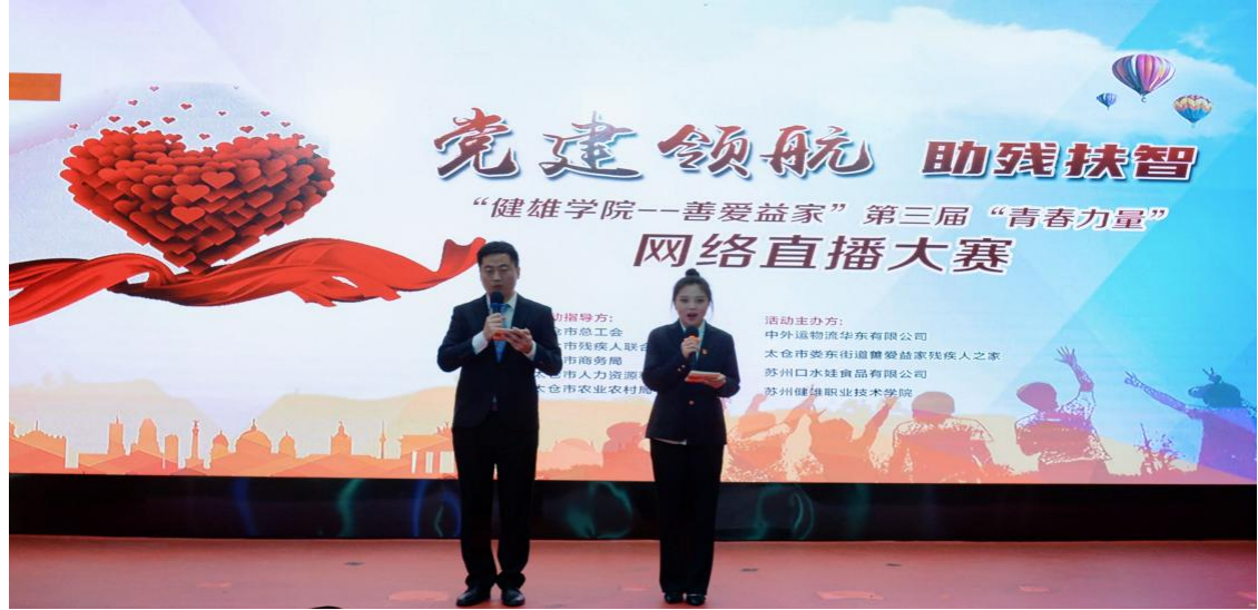 11月23日下午由太仓市总工会、太仓市残疾人联合会、太仓市商务局、太仓市人力资源和社会保障局和太仓市农业农村局指导,苏州健雄职业技术学院经济管理学院党支部联合中外运物流华东有限公司、娄东街道善爱益家残疾人之家、和苏州口水娃食品有限公司等,共同举办的“党建领航 助残扶智”“健雄学院--善爱益家”第三届“青春力量”网络直播大赛正式启动。