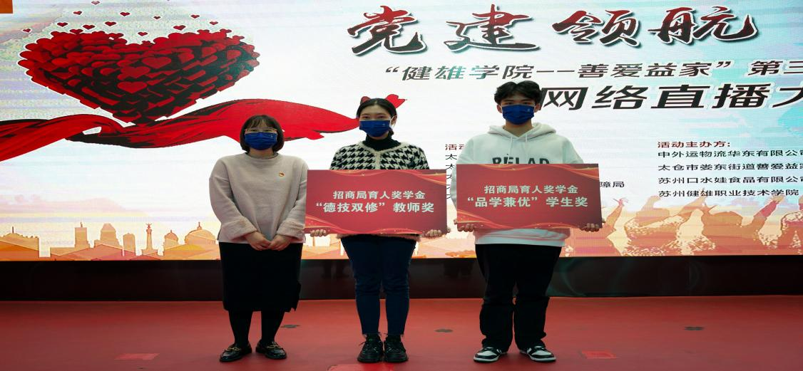 仪式上,太仓市总工会程杰、太仓市残疾人联合会王婷婷为德技双修、品学兼优和技能大赛获奖者颁发了“招商局育人奖学金”。最后部委办局领导、企业代表和苏州健雄职业技术学院等相关领导上台启动了本次直播大赛。