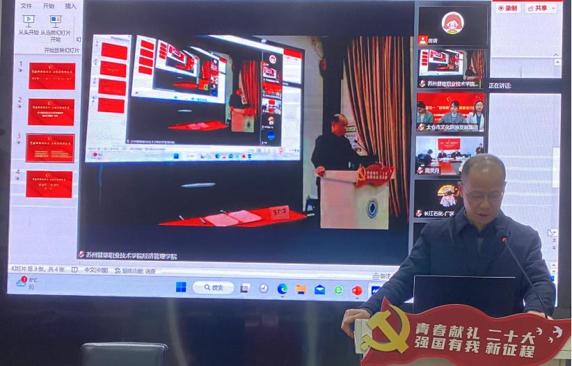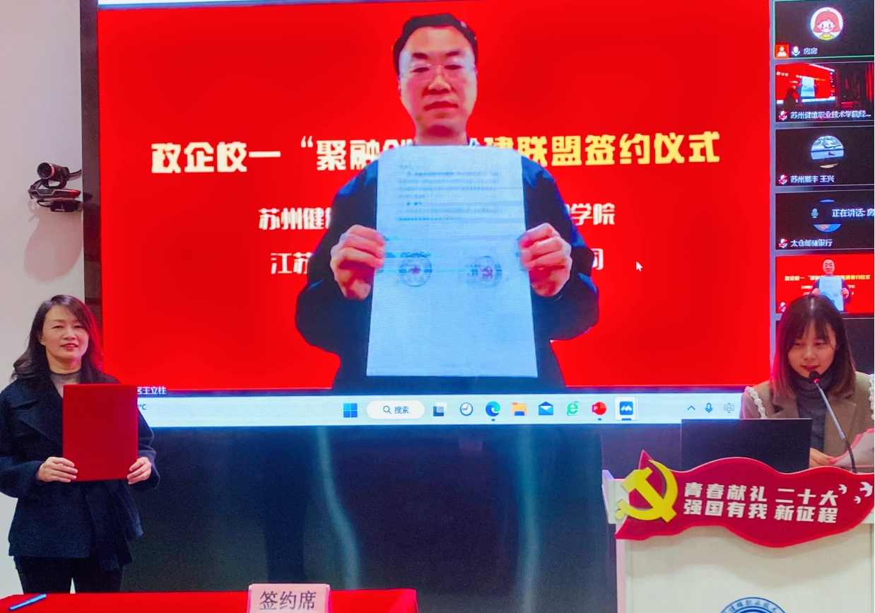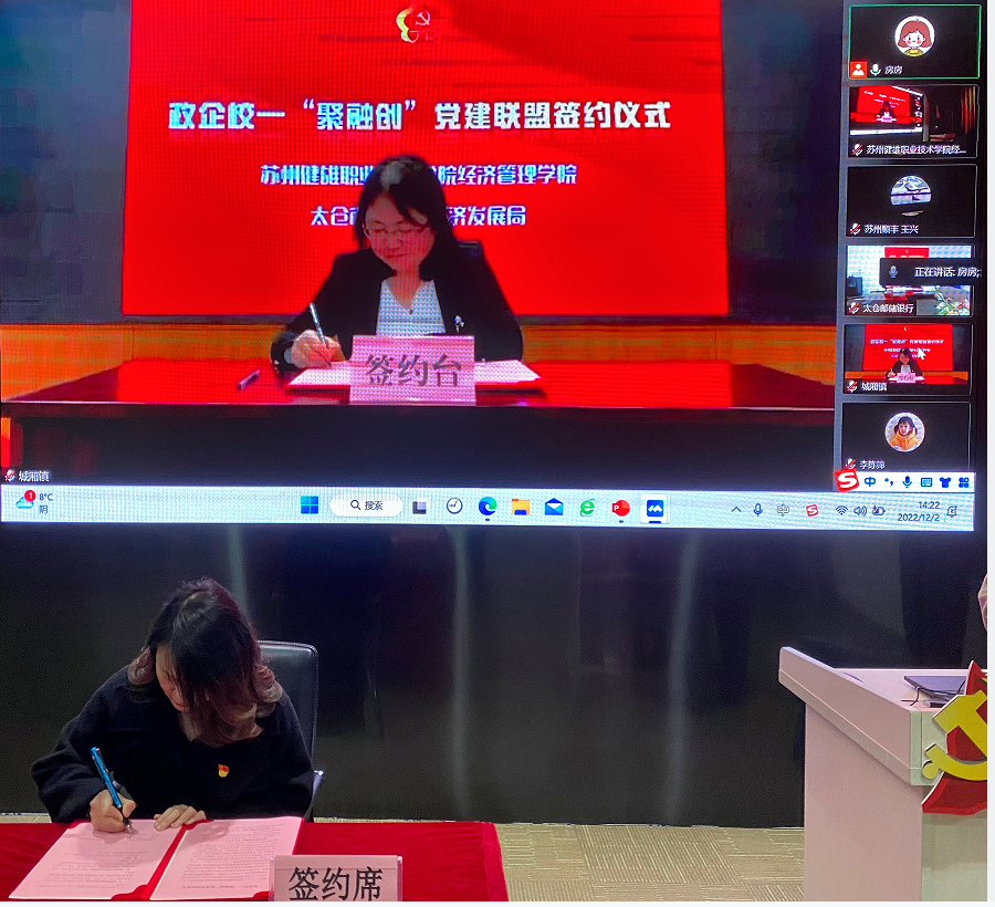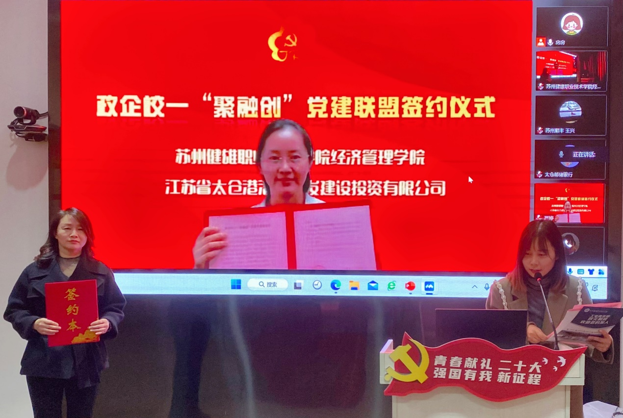 为进一步推动政企校党组织融合创新发展,苏州健雄职业技术学院经济管理学院党总支于12月2日举办“党建联盟添活力 互融互促谋发展”政企校党建联盟线上签约仪式暨“聚融创”大讲堂第一期活动。太仓市文体广旅局副局长杨冬梅,太仓市城厢镇经济发展局副局长王翠霞,江苏省太仓港港口开发建设投资有限公司党委副书记严婷,江苏长江石油化工有限公司党总支副书记李建清,中共飞力达国际物流股份有限公司党支部副书记王立柱,太仓市文化旅游发展集团有限公司总经理曹丹丹,中国邮政储蓄银行太仓支行副行长李陈筛,苏州顺丰速运有限公司国际业务部负责人(党支部书记)王兴8家联盟单位代表出席了此次活动。