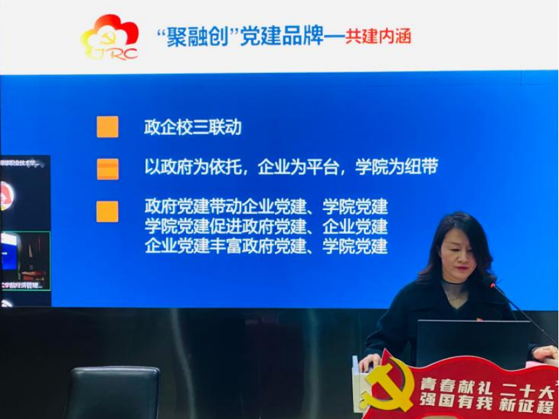 经济管理学院党总支副书记周丽雅从共建内涵、工作模式、工作成果、融合项目四个方面介绍了“聚融创”党建联盟项目的基本情况。党建联盟紧紧依托“聚融创”党建工作品牌,以“九联九共”为桥梁,整合各方资源,打造政企校理论学习、人才培养、科技创新、社会服务等方面的重点项目合作平台。