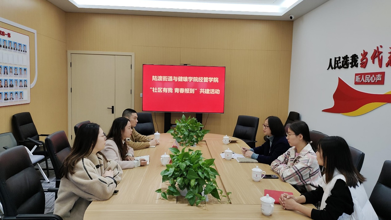 在陆渡街道党群服务中心,王玉一行受到陆渡街道团工委副书记张静涵等人的热情接待。张静涵介绍了陆渡街道目前设施建设、特色活动开展、志愿服务等方面,双方就”十四五“规划期间,社区和经管学院间的“党建带团建”工作进行了充分的交流,将立足学校发展目标,加强区校联动,融入社区、服务地方经济、环境等。