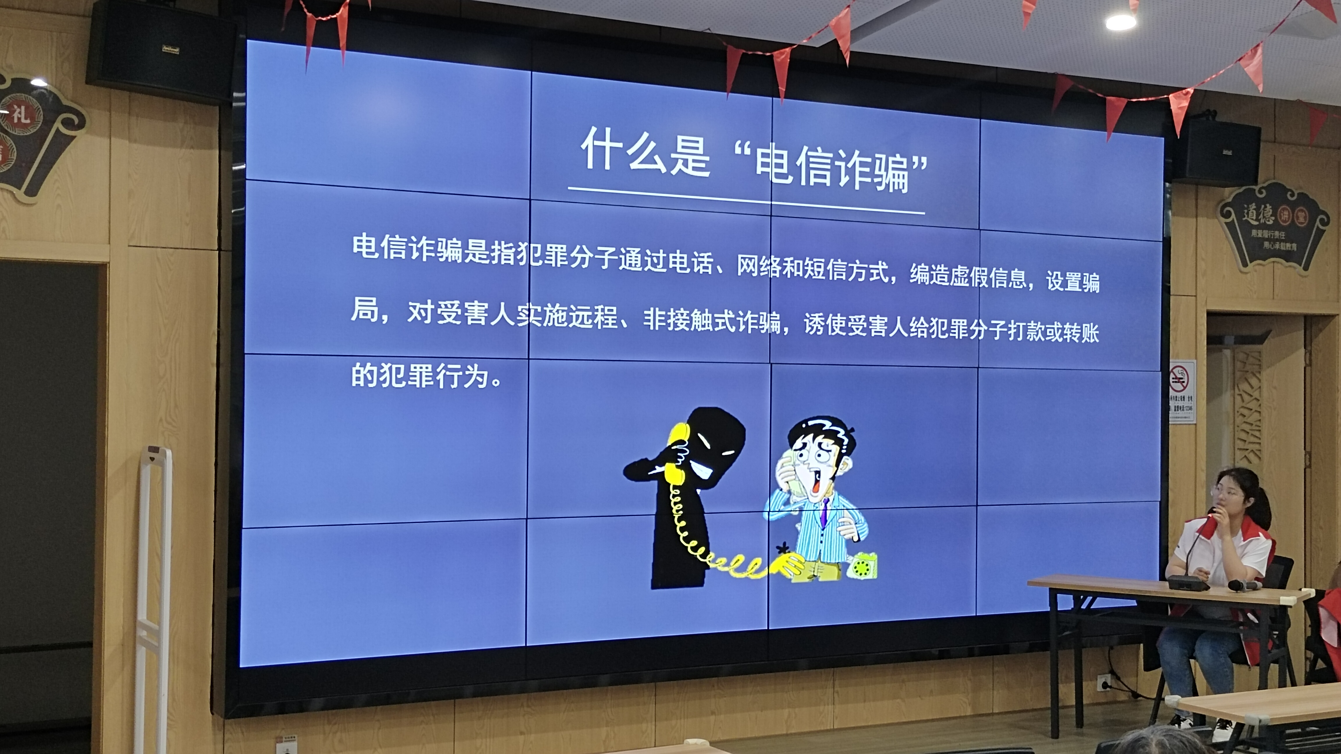 活动现场,我院学生通过开展防诈骗知识讲座的方式,向社区老人讲解了什么是电信诈骗以及电信诈骗的各种手段,并提醒老年人不要轻信陌生来电、不明信息,不向陌生人透露自己和家属的信息,遇事多与子女沟通。同时,还有针对性地讲解了诈骗的防范技巧,进一步提升了社区老人对诈骗的认知度和辨认度。