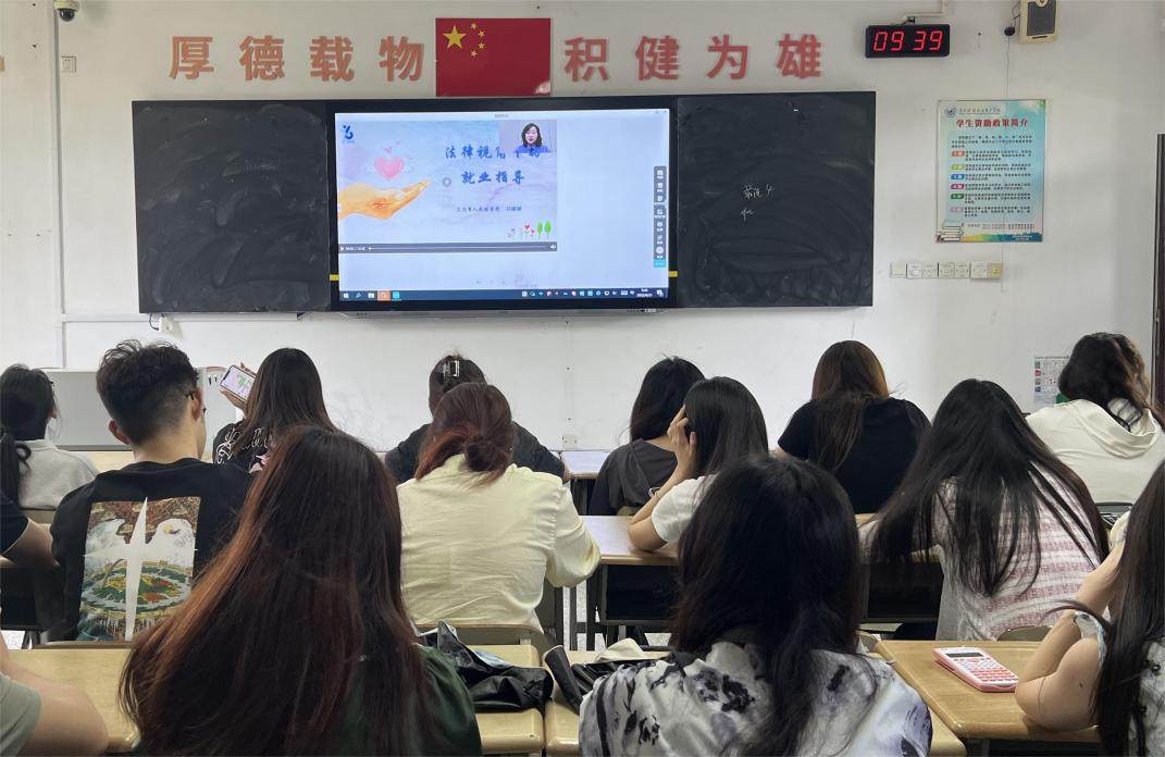 班会课上,同学们聚精会神的观看视频。刘娜娜检察官通过一系列真实深动的案例,给同学们普及了常见的一些招聘陷阱,提醒大家提高法律安全意识,同时贴心细致的为大家解读了《中华人民共和国劳动合同法》中,与初入职场的大家密切相关的条款内容。