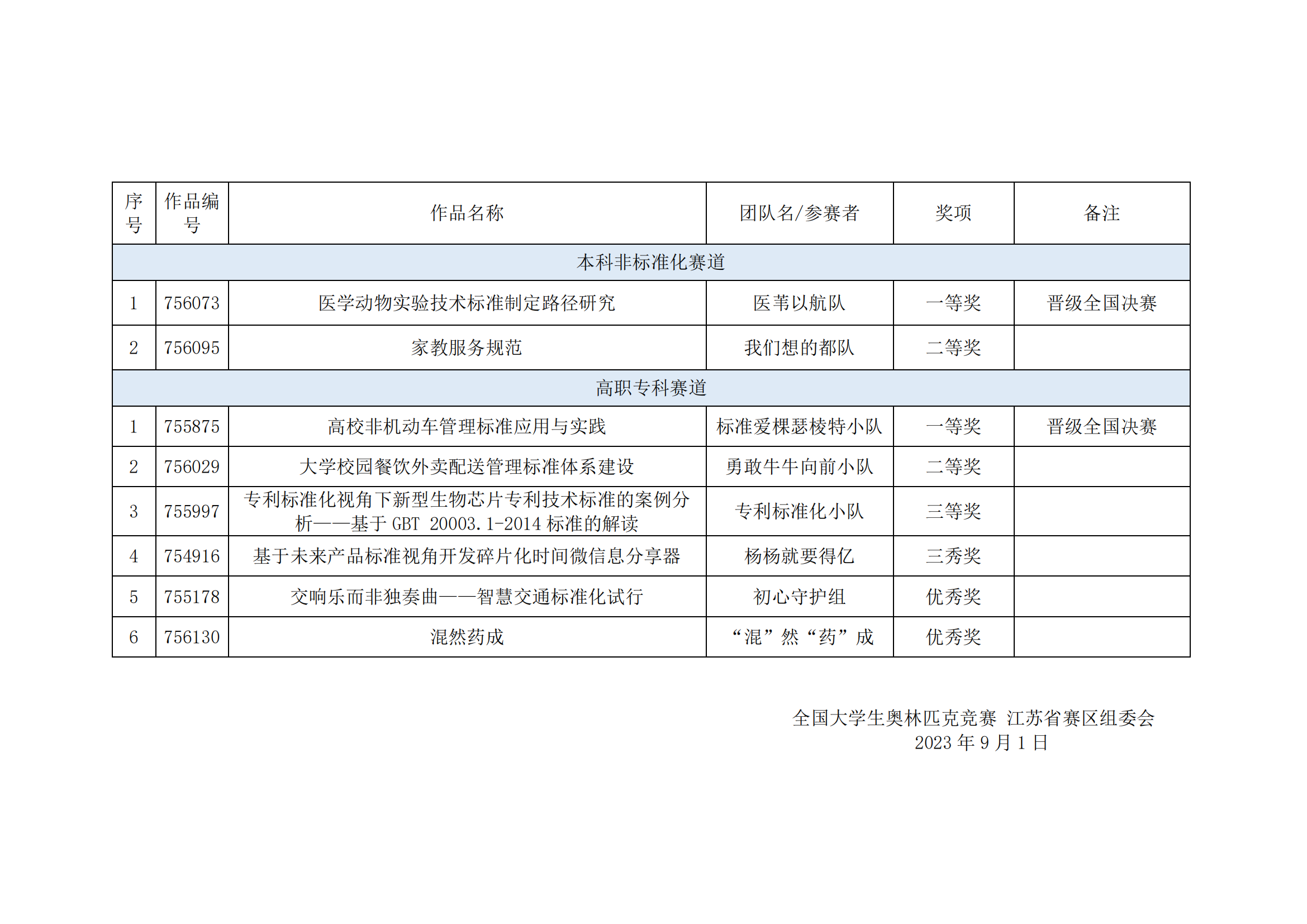 标准化2212班陈梅以及陈果同学团队《大学校园餐饮外卖配送管理标准体系建设》获大赛二等奖。王诗杰团队《专利标准化视角下新型生物芯片专利技术标准的案例分析——基于 GBT 20003.1-2014 标准的解读》获大赛三等奖。杨世豪团队《基于未来产品标准视角开发碎片化时间微信息分享器》获大赛三等奖。