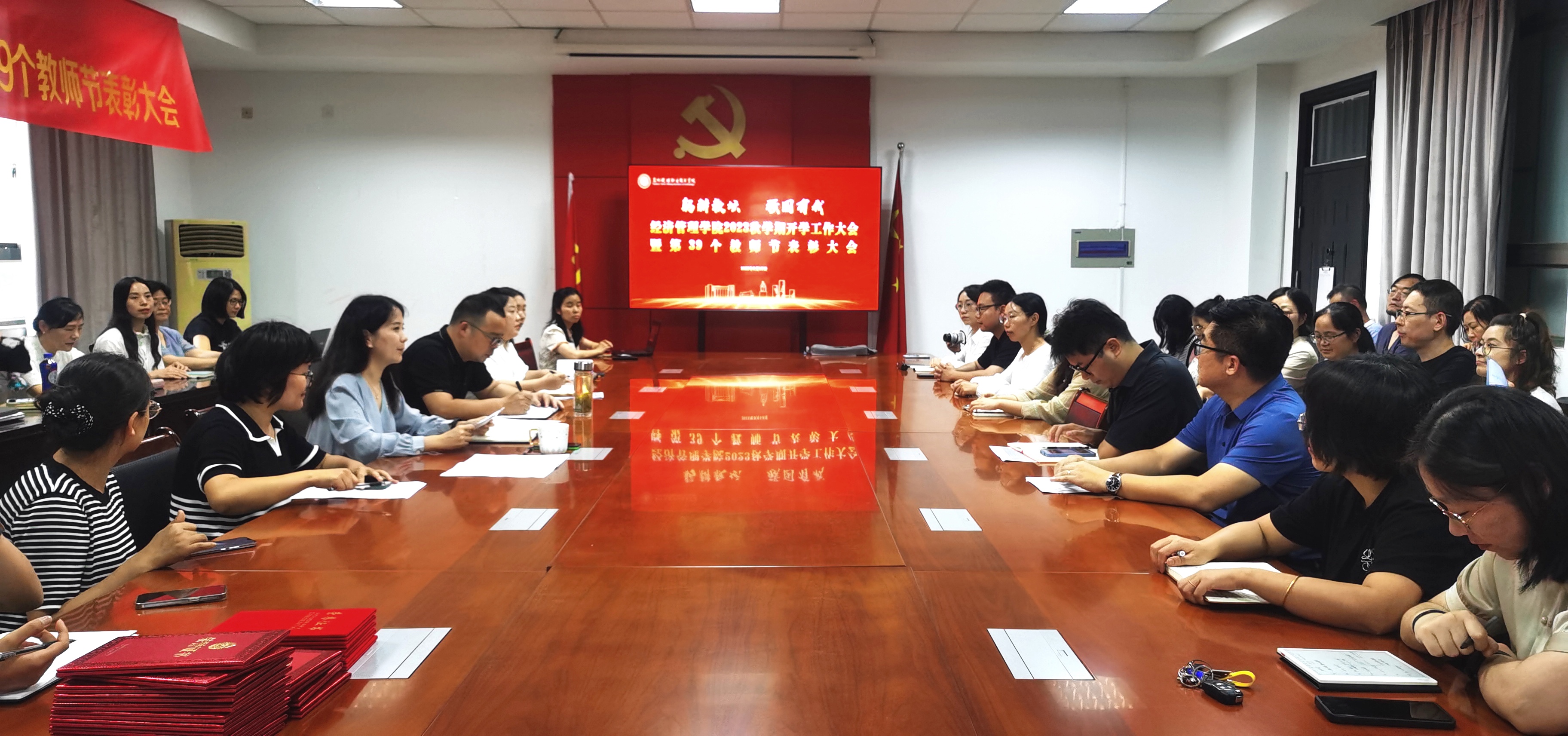 2023年9月13日下午,经济管理学院全体教职工在C3-202会议室召开新学期开学工作大会,经济管理学院院长樊奇、党总支副书记沈晓婷、副院长傅兰出席会议。