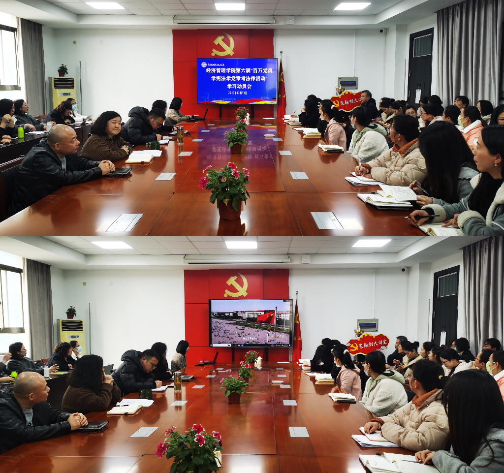 今年12月4日是第十个国家宪法日。正值江苏省第六届百万党员学宪法学党章考法律活动开展之际,为深入学习贯彻党的二十大精神、进一步夯实思想基础、提升法治素养,充分发挥党员学习、遵守、维护宪法的表率示范作用,引导全体教师弘扬宪法精神,维护宪法权威,增强法治意识,12月13日下午,经济管理学院集中开展党员教育和教职工政治理论学习活动暨第六届“百万党员学宪法学党章考法律活动”学习动员会。