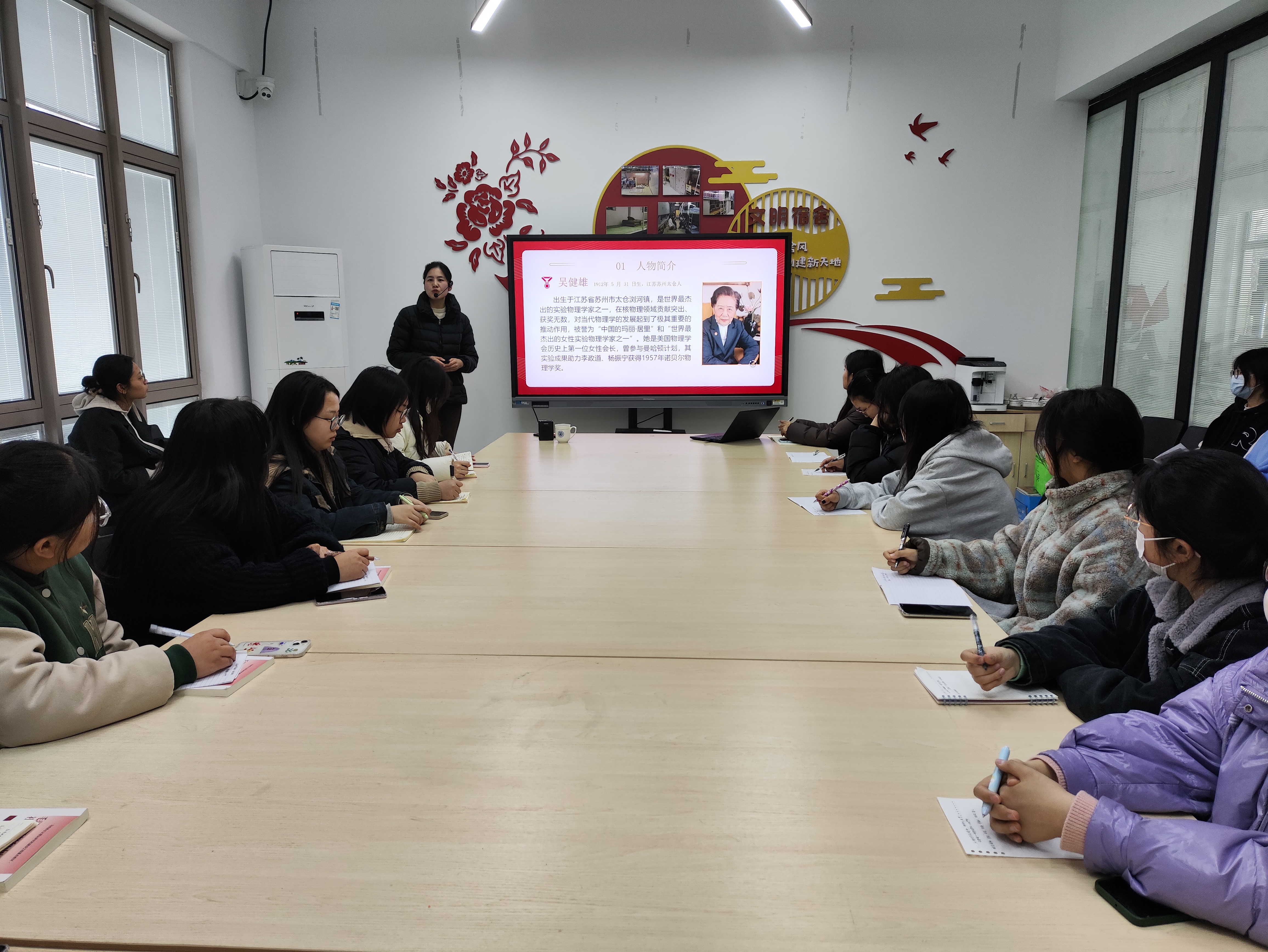 冯老师向同学们介绍了科学家精神的基本内涵,重点讲述了吴健雄博士的生平事迹,包括其在物理学领域的杰出贡献、对科学事业的执着所展现出的坚定信念以及身在国外、心怀中华的爱国情怀,以此展现出吴健雄博士终身不渝的爱国精神、勇于探索的创新精神、实事求是的科学精神以及谦虚俭朴的律己精神。冯老师强调,新时代青年需践行科学家的爱国与奋斗精神,将个人理想与国家发展结合,严谨认真地完成本职工作,以切身实践弘扬科学家精神,为国家繁荣和民族崛起不懈努力。