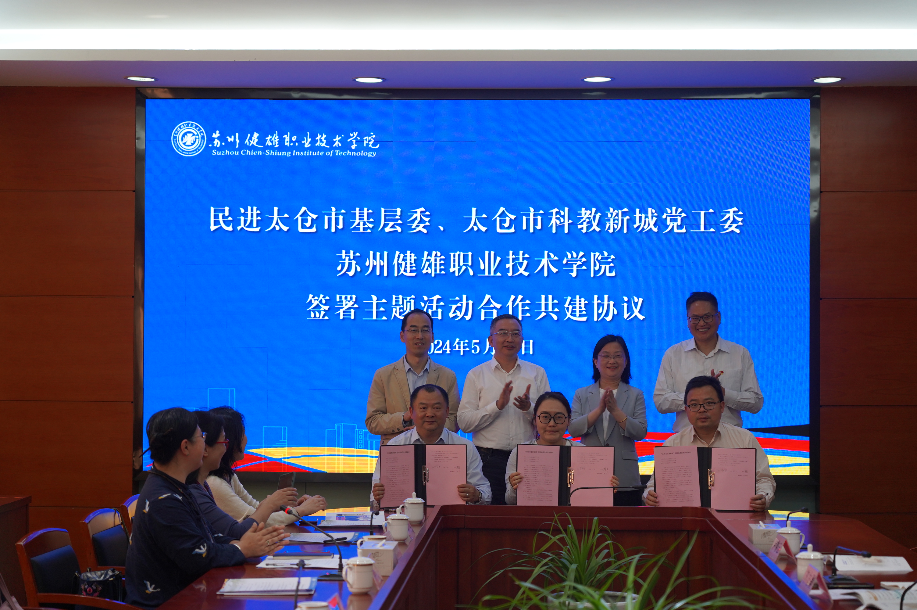 民进太仓市基层委、太仓市科教新城党工委、苏州健雄职业技术学院签署主题活动合作共建协议,民进太仓市基层委委员、高教支部主委苏志勇,科教新城统战干事卢梦云、苏州健雄职业技术学院经济管理学院院长樊奇代表三方签约,王孝红、王燕、陈洲洋、丁锴共同见证。