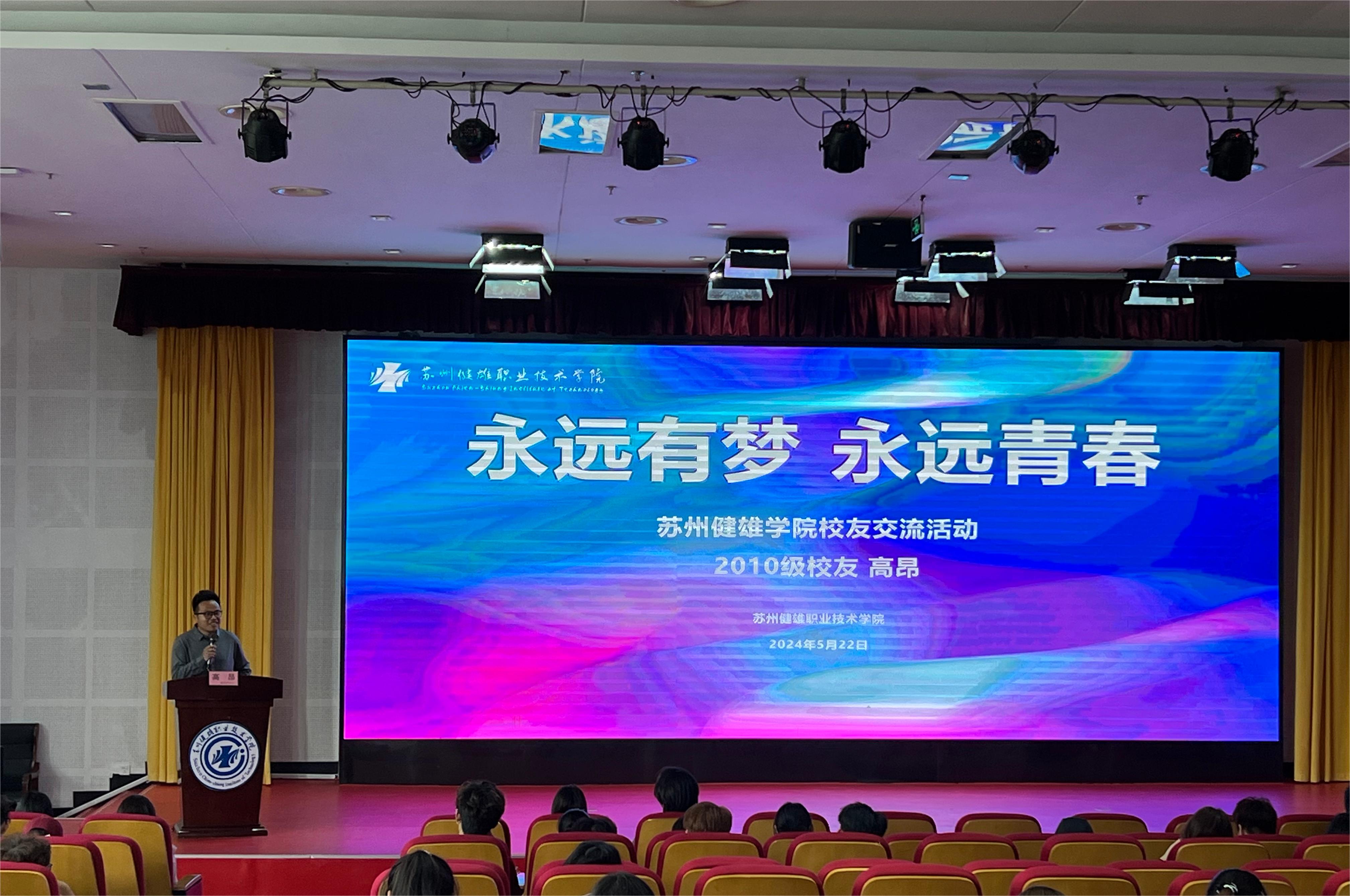 伴随着学弟学妹们的热烈掌声,高昂学长开启了以《永远有梦 永远青春》为主题的分享。高昂学长分享了自己在健雄的生活和求学经历,详细讲述了自己在学生会的工作经历。接着,他分享了自己毕业后的工作经历及感受,传递出面对困难与挑战时的坚持与勇气,他强调了持续学习的重要性,并建议同学们要不断提升自己的综合素质,以适应快速变化的社会环境,引导学弟学妹们做好生涯规划。