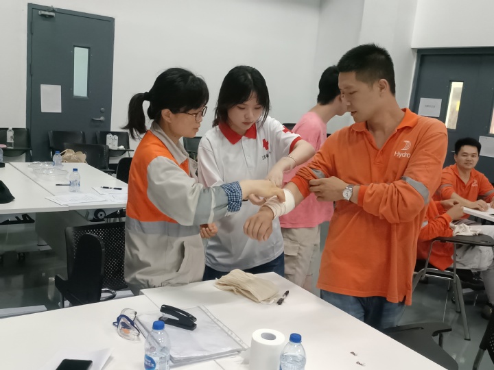 志愿服务队还进行了创伤救护技能培训,课程围绕常见急症及意外伤害、创伤救护等内容开展理论讲解和实操培训。课程中讲师详细展开讲解了止血、包扎、固定、搬运四项技能,引导工人们分组练习,服务队志愿者深入到学员中,手把手教学。良性互动的教学方式极大地激发了工人们的学习兴趣,让他们在轻松愉快的氛围中掌握了急救知识。工人们表示这种互动实操的学习方式有效提高了学习效率,让他们在面对可能的突发的情况时,能够更加有信心从容应对。
