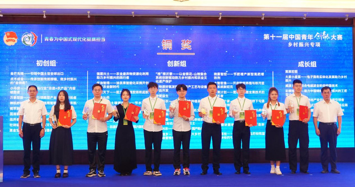 本次中国青年创青春大赛(乡村振兴专项)项目众多、竞争激烈,从全国5495个参赛团队中脱颖而出的141个晋级项目齐聚漳州。其中,经济管理学院周姚沙、龚佳妮、章子贤等同学组建的“彩鳞智匠”项目团队经过半决赛、决赛的激烈角逐,成功取得国赛成长组铜奖的优异成绩。