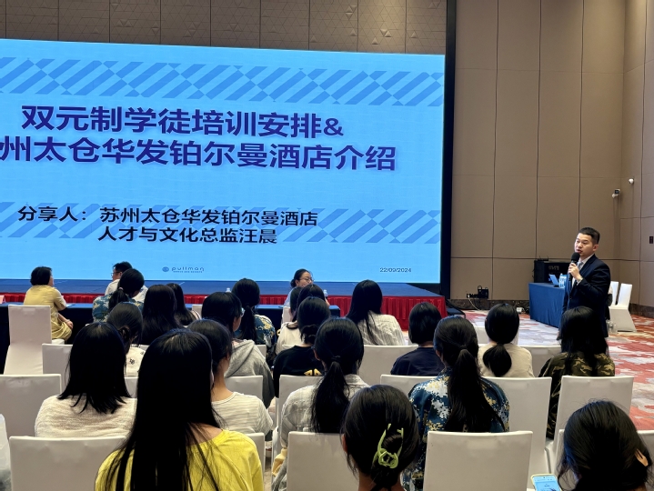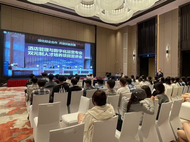 为深化校企合作,拓宽学生实践与学习渠道,提升就业竞争力,2024年9月22日晚,经济管理学院在太仓华发铂尔曼酒店举行了双元制人才培养项目宣讲会。中德双元制学院副院长郑爱权、经济管理学院副院长傅兰、铂尔曼酒店人力资源部负责人汪晨、酒店管理与数字化运营专业负责人陈祎、辅导员雷婧翎及2024级酒店管理与数字化运营专业全体新生参加本次宣讲会。
