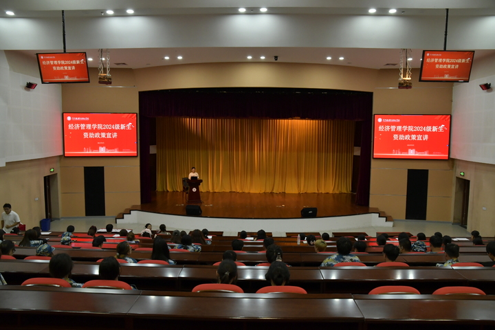 2024年9月22日晚,经济管理学院“紫薇”思政大讲坛暨2024级新生入学教育活动在学校二期报告厅举行。辅导员张丽丽老师为2024级全体新生作资助政策宣讲。