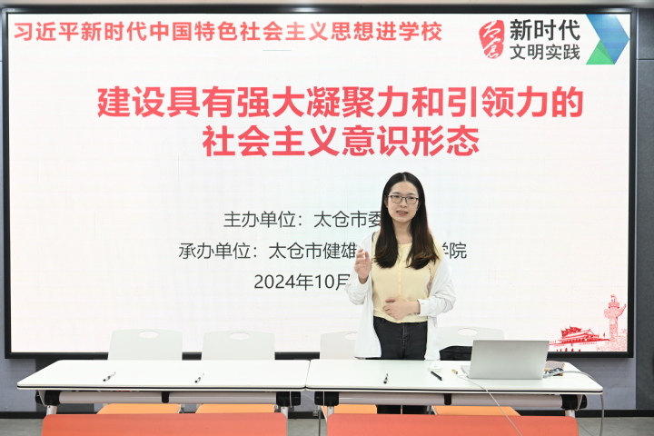 学习会邀请了中共太仓市委党校教师、“娄城飞燕”理论宣讲员肖雪与会作专题讲座。肖老师从“意识形态”理论的基本内涵、为什么要建设具有强大凝聚力和引领力的社会主义意识形态、如何建设具有强大凝聚力和引领力的社会主义意识形态等三个模块为我们讲解了意识形态理论的形成与发展,分析了当前意识形态领域存在的重大风险。肖老师的授课,既有理论高度,也有实践深度,内容深入浅出、诠释充分具体,结合工作实际,教育引导大家筑牢思想上的“防火墙”,切实增强新时代意识形态的凝聚力和引领力,从更高站位新时代抓好宣传思想和意识形态工作。