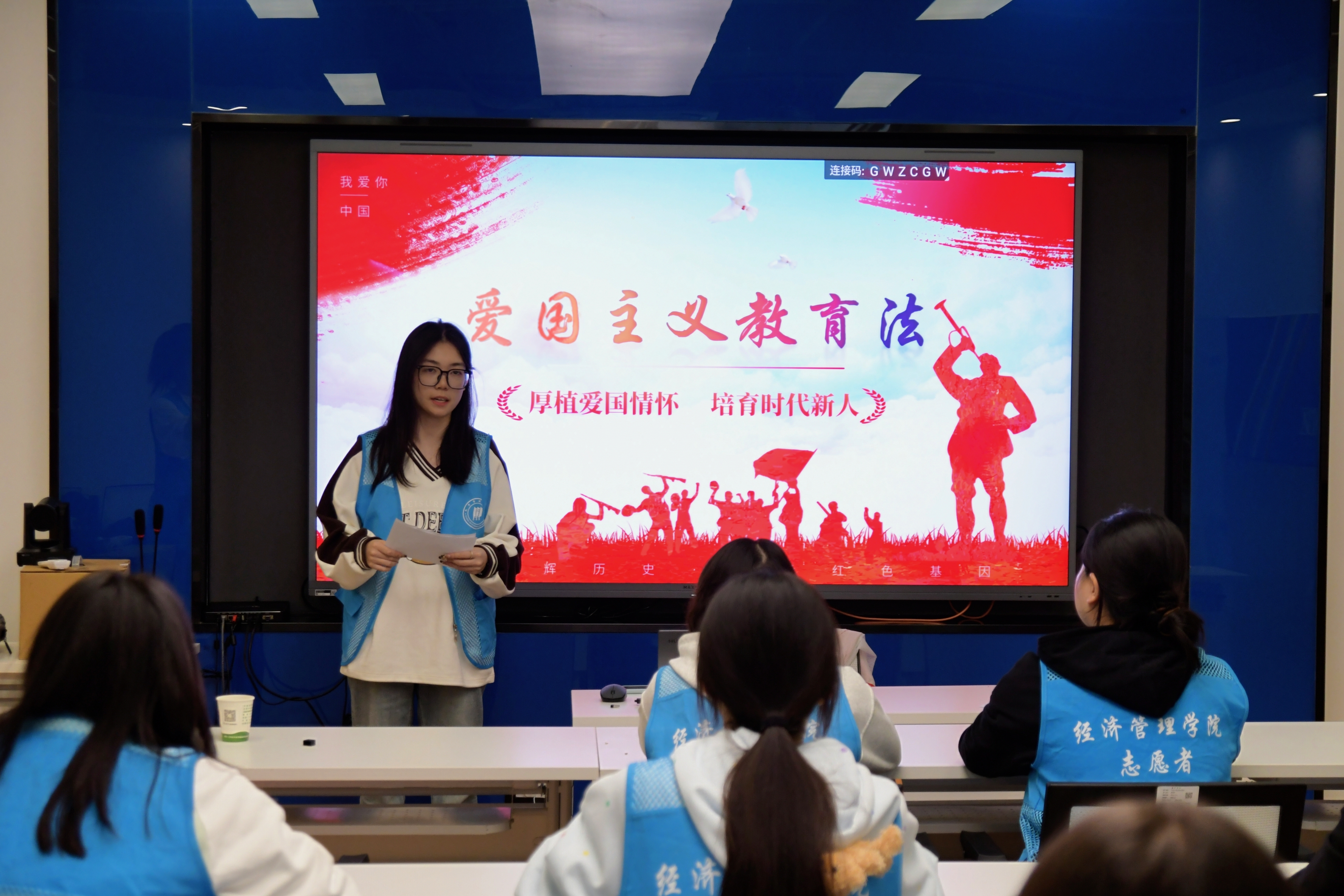 习近平总书记强调“爱国主义是中华民族精神的核心,是中华民族团结奋斗、自强不息的精神纽带”。为积极弘扬爱国主义精神,深化爱国主义教育,在《中华人民共和国爱国主义教育法》颁布一周年之际,经济管理学院联合陆渡街道翱翔社区开展“厚植爱国情怀 培育时代新人”《中华人民共和国爱国主义教育法》颁布一周年主题团日活动。