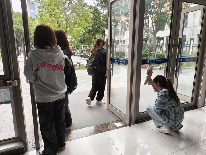 活动伊始,同学们在了解了需要完成的任务后,进行了分组,干劲满满地投入到清洁美化任务中。同学们在擦拭玻璃、扶手,整理杂物时有条不紊、互相配合,高效地完成了清扫任务。经过同学们细心认真的打扫,社区走道每一个角落都干净整洁,室内窗明几净,装饰物的摆放井井有条,让整个一站式社区焕然一新。