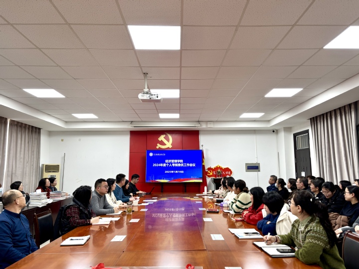 为全面总结经济管理学院全体教职工2024年工作成效,做好年度考核评优工作,同时表彰先进,充分调动教职员工的工作积极性。经济管理学院于2024年1月10日组织召开了2024年度教职工述职评优考核工作会议。学院全体教职工参会,会议由经济管理学院院长樊奇主持。
