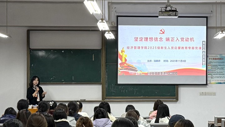 2025年11月4日晚,经济管理学院第九期业余党校开班典礼在C3-301教室举行,学院党总支负责人、学生党支部负责人、相关教师党员及138名学员参加开学典礼。