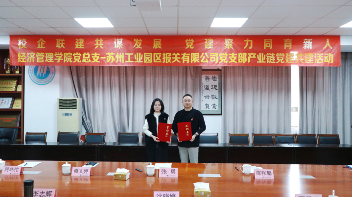 为深入推进“高校党组织对接产业链党组织”工作,以党建引领凝聚校企合作合力,12月4日下午,经济管理学院与苏州工业园区报关有限公司在C3-202会议室开展“校企联建共谋发展党建聚力同育新人” 经济管理学院与苏州工业园区报关有限公司产业链党建共建活动。苏州工业园区报关有限公司党支部书记张勇率领支部委员一行及经济管理学院党总支各支委、支部书记代表出席活动,活动由党总支书记沈晓婷主持。