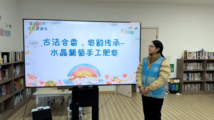 活动中,志愿者为孩子们分发肥皂、麻绳等材料,并以“水晶葡萄”为造型主题,逐步讲解制作方法,协助完成塑形、穿孔、系结等步骤。活动现场氛围专注而热烈,洋溢着手作的乐趣。