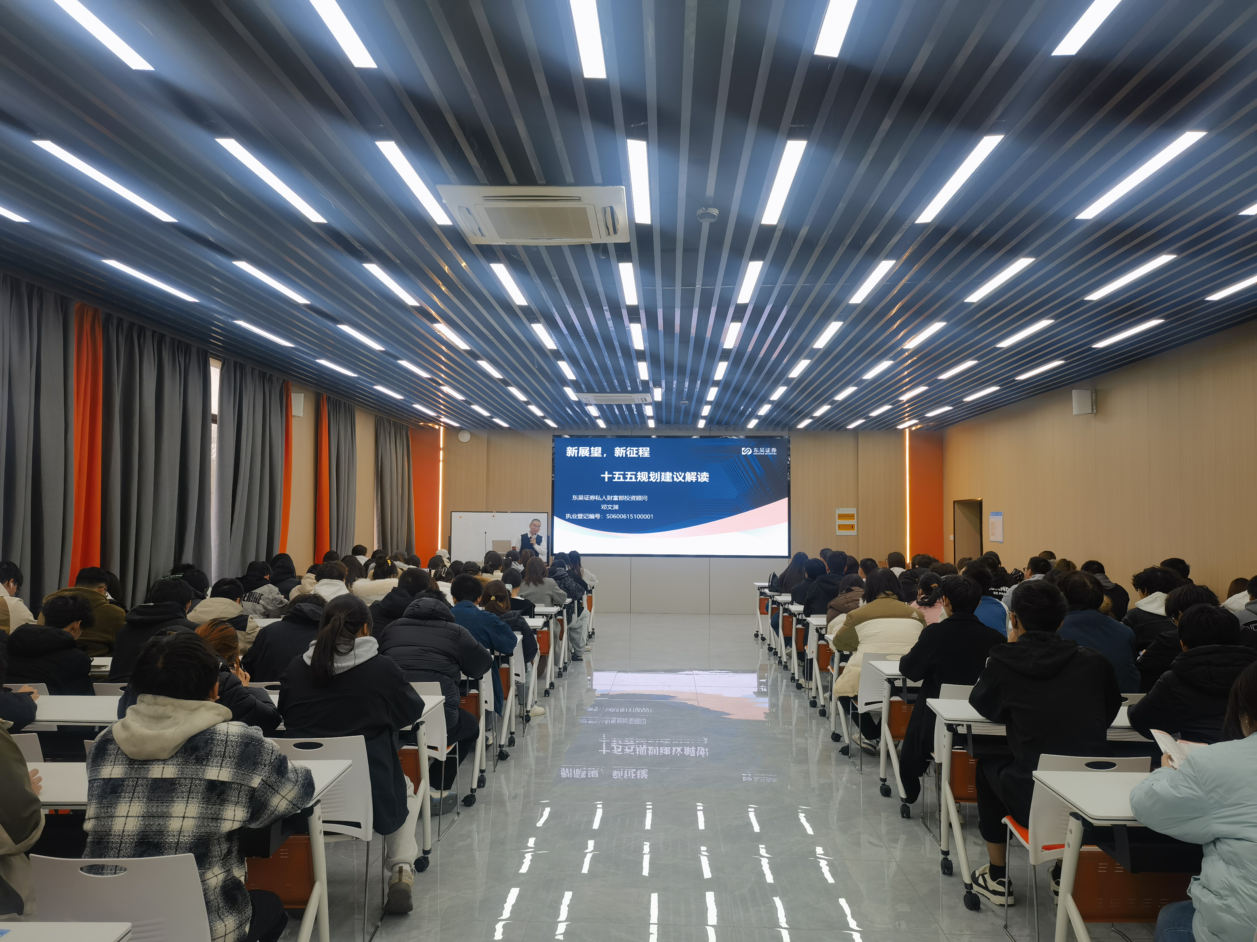 讲座分为两个部分进行。第一部分由东吴证券总部邓文渊老师主讲,主题为新展望新征程——十五五规划建议解读。邓老师从宏观经济形势出发,深入浅出地分析了国家十五五规划的重要意义和主要目标,帮助同学们更好地理解国家展战略,明确个人发展方向。