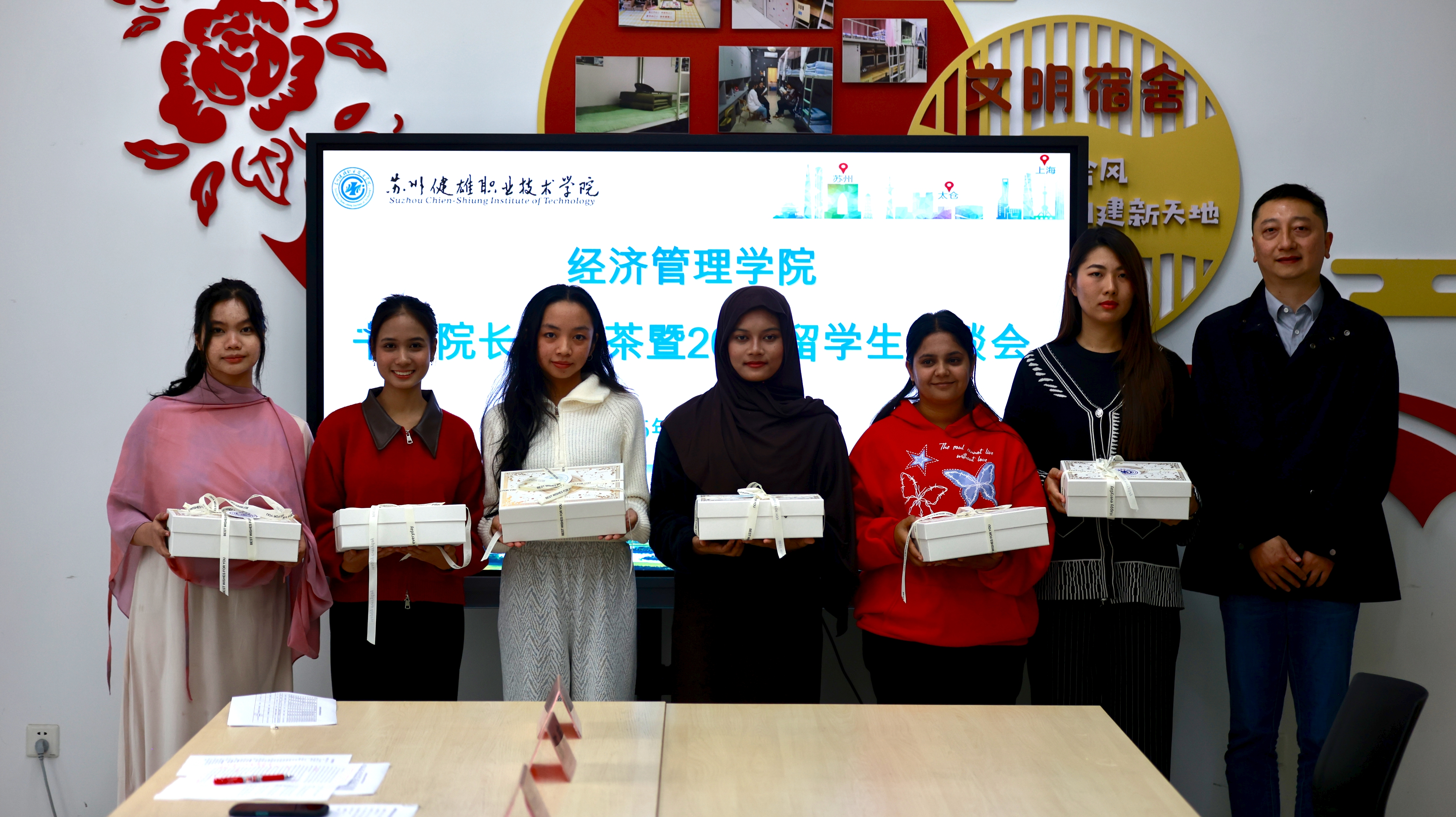 座谈最后,学生处处长丁铁锋为2025级留学生新生代表颁发了精心准备的新生礼包,座谈会在温馨融洽的氛围中圆满结束。
