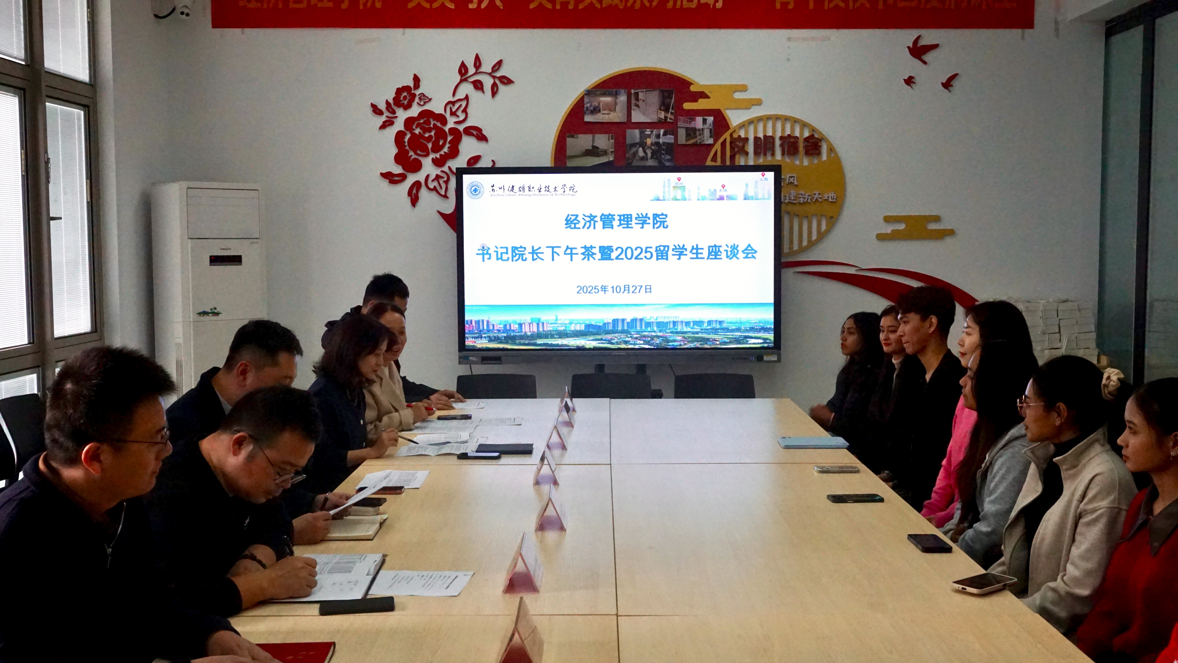 为深入了解留学生学习与生活状况,营造开放包容的国际化育人环境,10月27日下午,经济管理学院在紫薇社区暖心举办“书记院长下午茶”暨2025留学生座谈会。学院党政班子领导、国际交流处处长朱慧及学生工作处处长丁铁锋与来自多国的留学生新生代表齐聚一堂,畅谈心声,共话未来。会议由党总支书记沈晓婷主持。