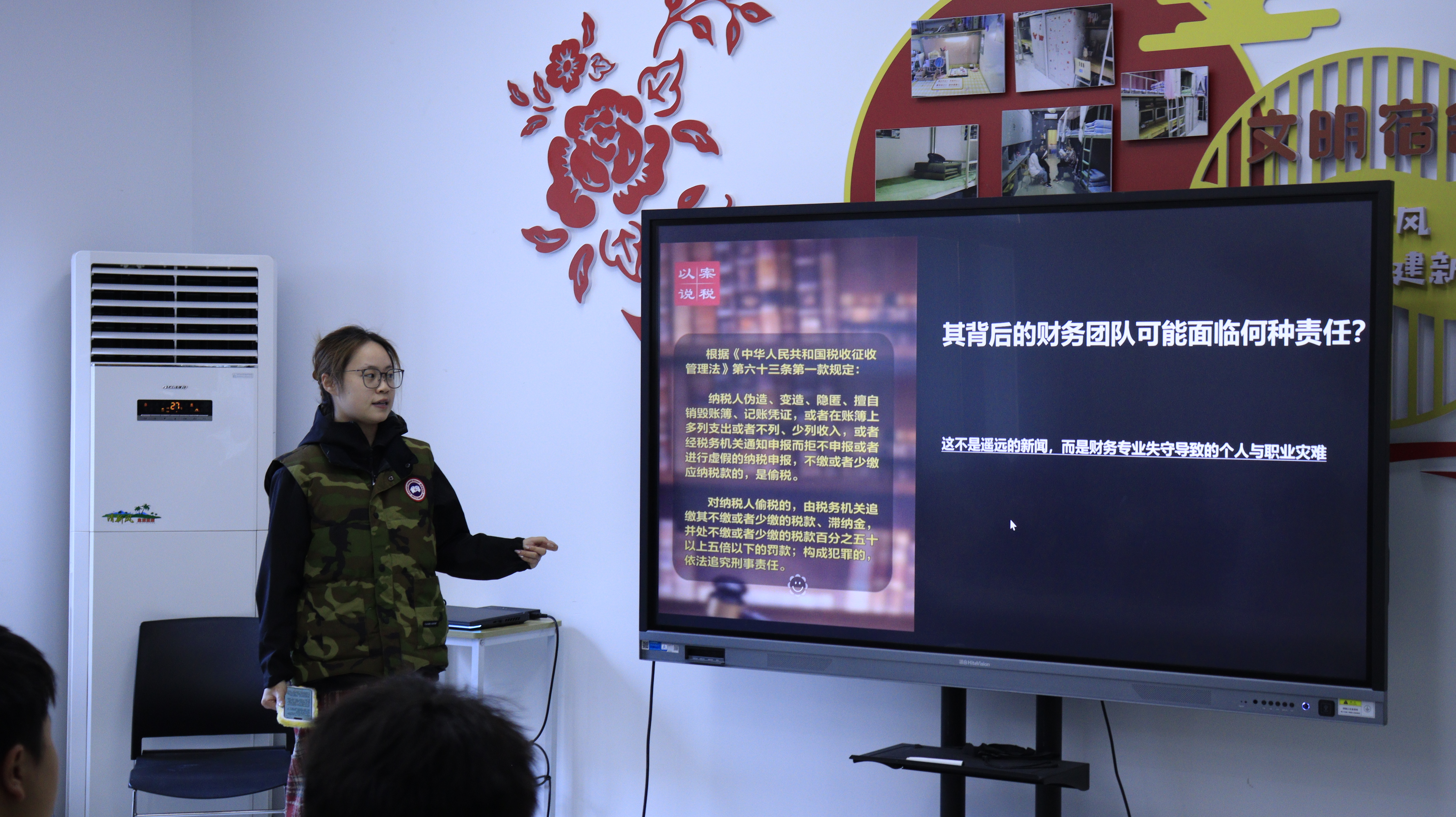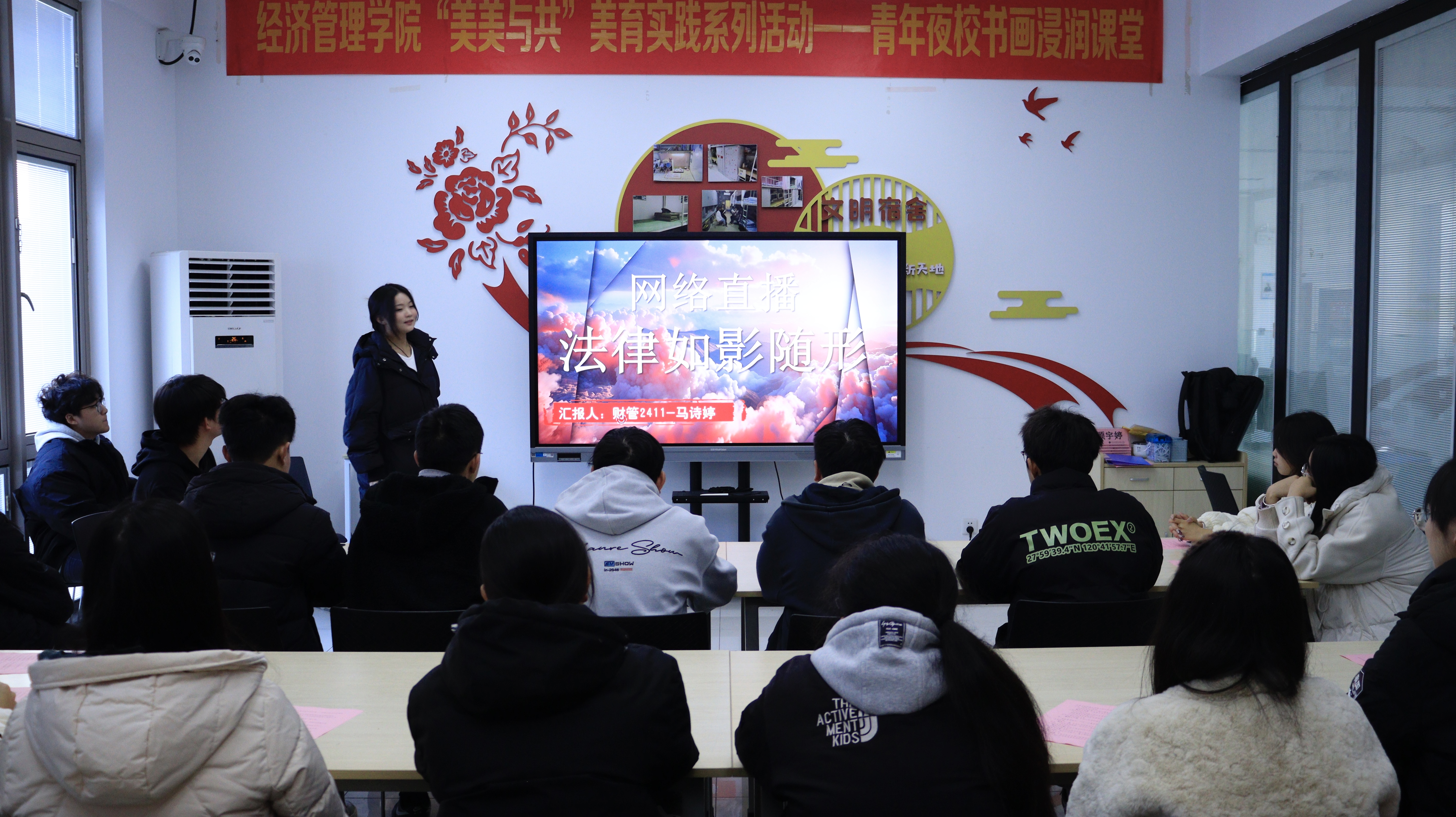 接着,由2024 级财务管理专业学生肖志红以实践中的财务合规案例为切口,剖析宪法如何为劳动者权益筑牢 “防护墙”;“新媒体创客社”社长马诗婷同学结合直播带货监管实际,阐释宪法原则与职业发展的内在关联,引发 “法治如何为技能成才护航” 的深度探讨。