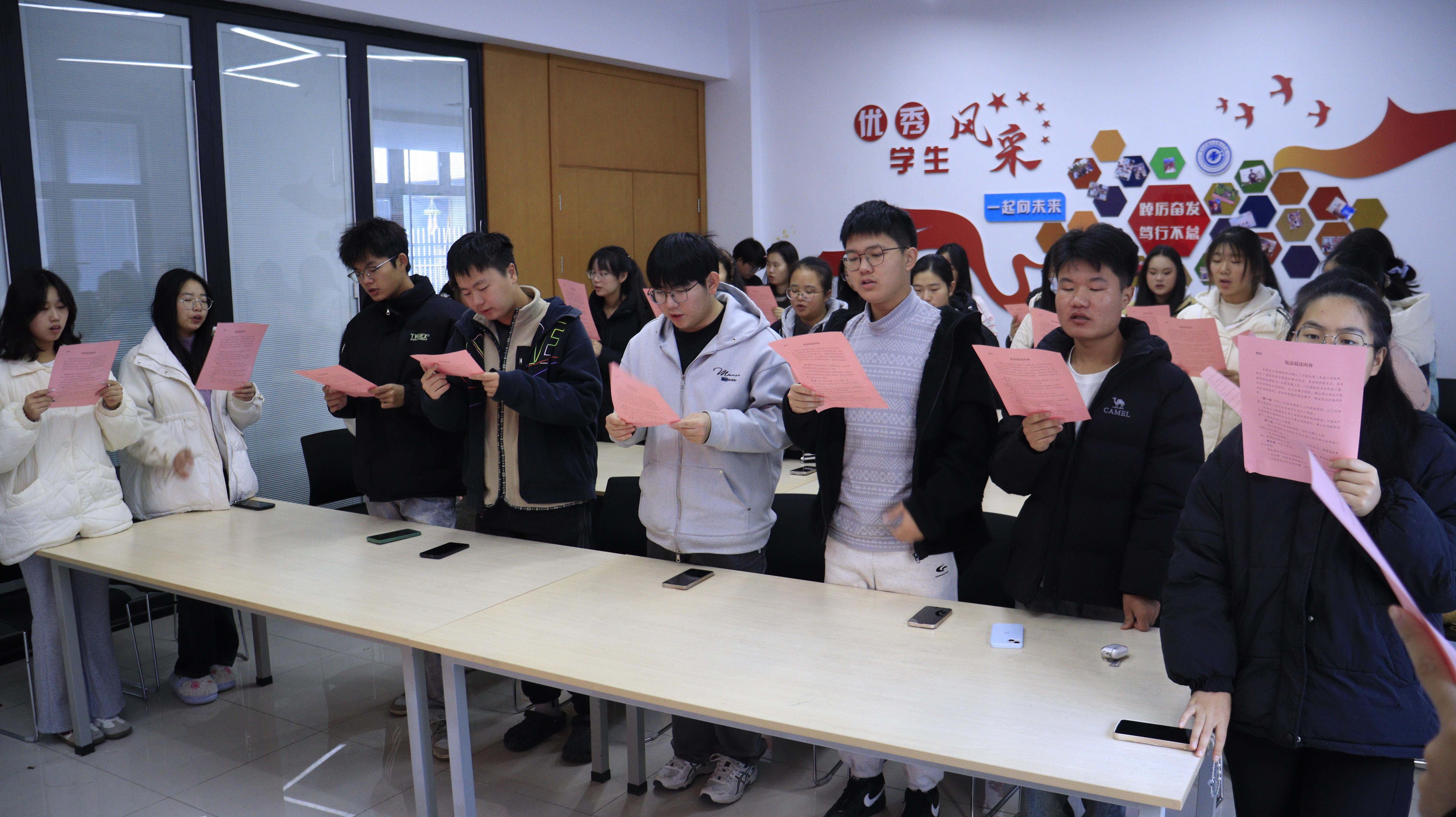为深入学习宣传习近平法治思想,大力弘扬宪法精神,增强青年学生的宪法意识与法治素养,2025年12月4日上午经济管理学院,在“紫薇”一站式服务社区组织30余名学生代表开展2025年国家宪法日教育系统“宪法晨读”活动,让学生们沉浸式感受宪法权威,接受法治文化熏陶。