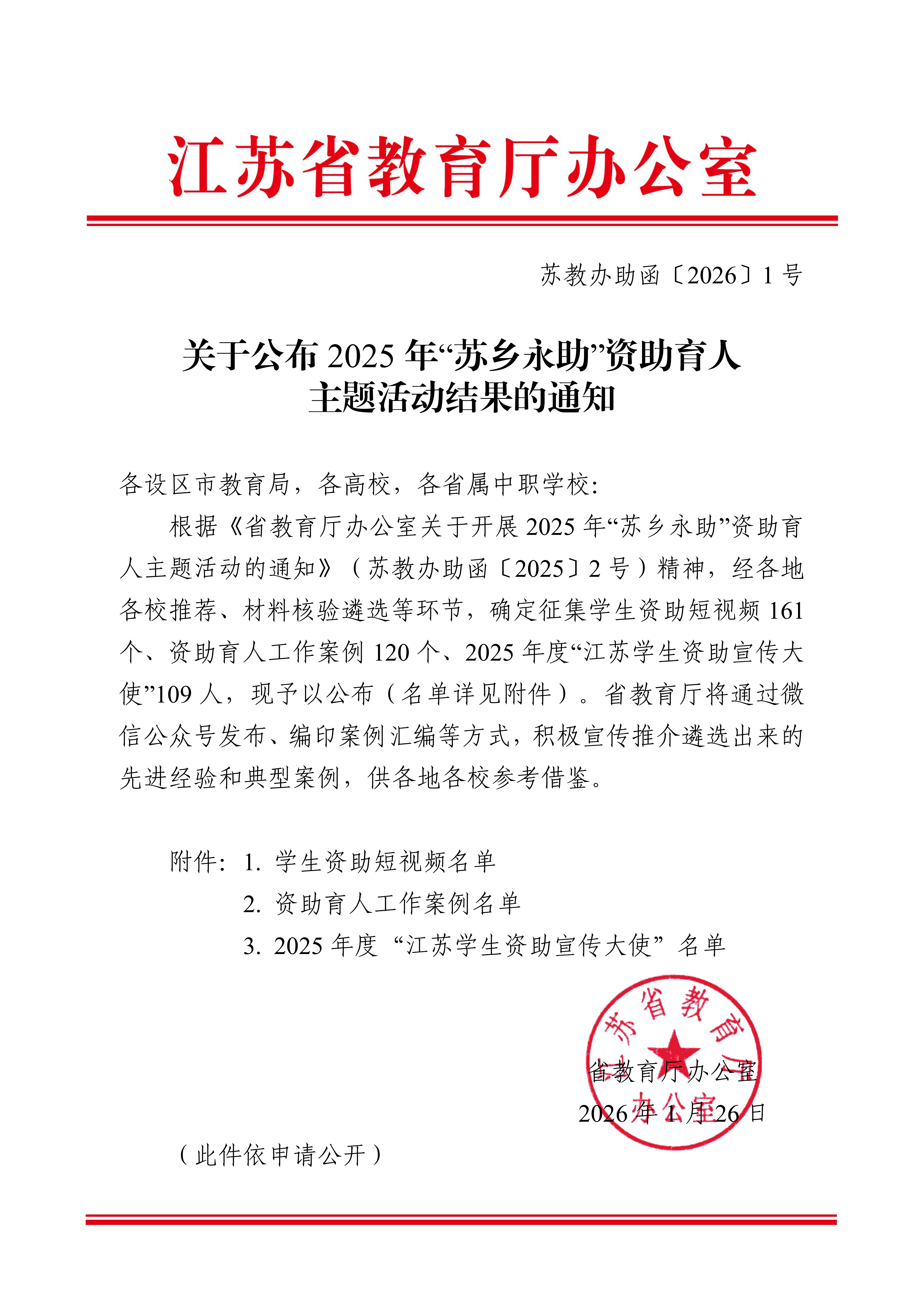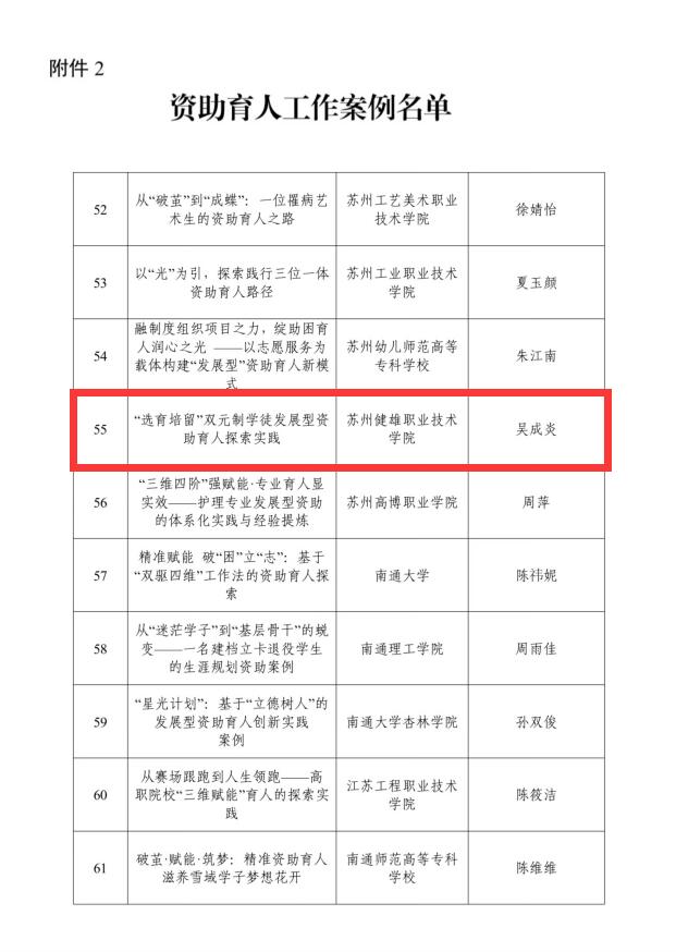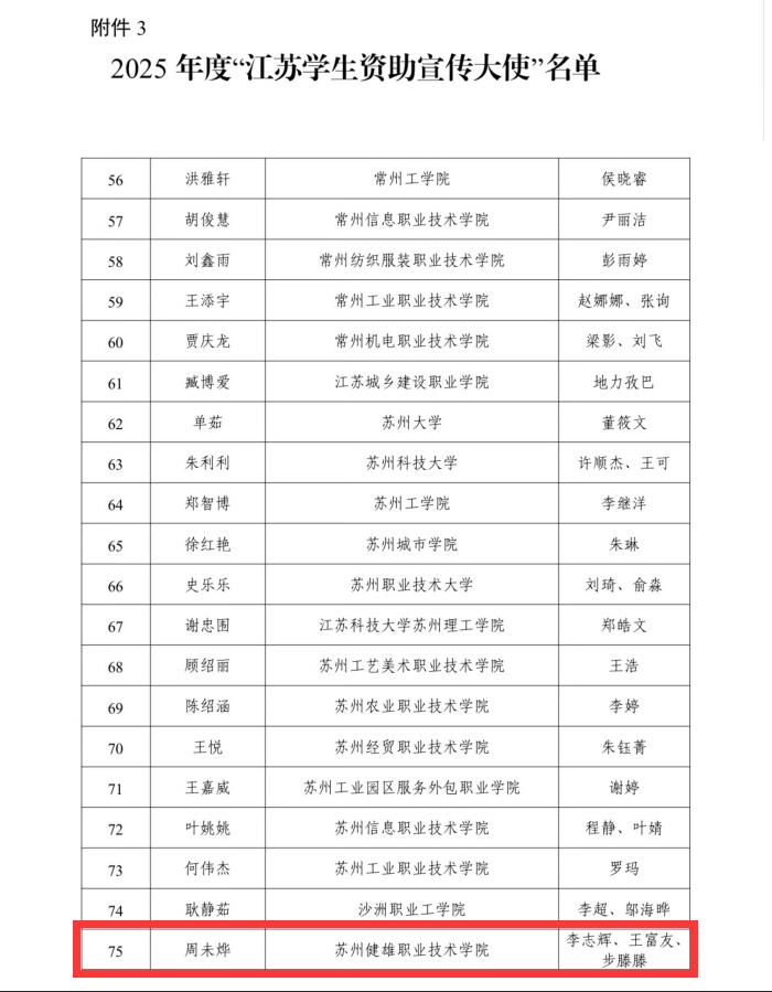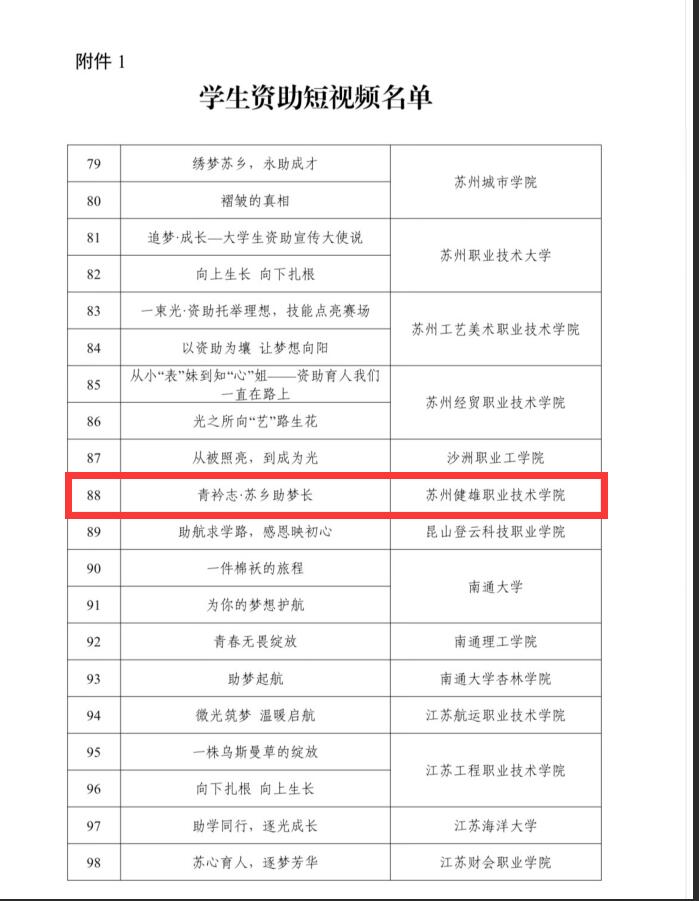 近日,江苏省教育厅公布2025年“苏乡永助”资助育人主题活动的评选结果,我院实现三类成果全覆盖,斩获佳绩!其中生物医药学院药品生产技术专业支玲珑同学的原创视频《青衿志·苏乡助梦长》获评学生资助短视频;智能制造学院吴成炎老师的《“选育培留”双元制学徒发展资助育人探索实践》获评资助育人工作案例;经济管理学院现代物流管理专业的周未烨同学获评“江苏学生资助宣传大使”称号。