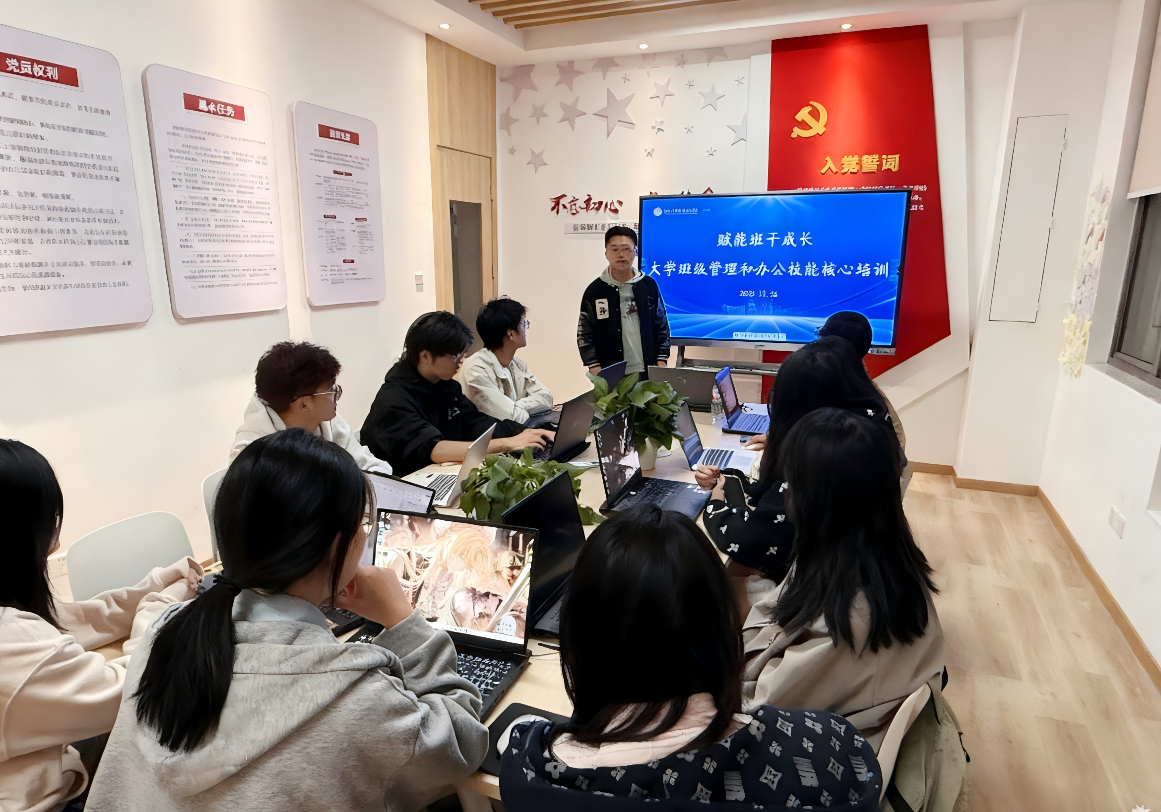 为提升班级干部综合能力,筑牢班级管理根基,10月26日晚,艺术设计学院在“一站式”学生社区举行“班级管理与办公技能核心培训”,2025级部分学生干部参加培训,学院辅导员康文杰老师担任主讲人 。