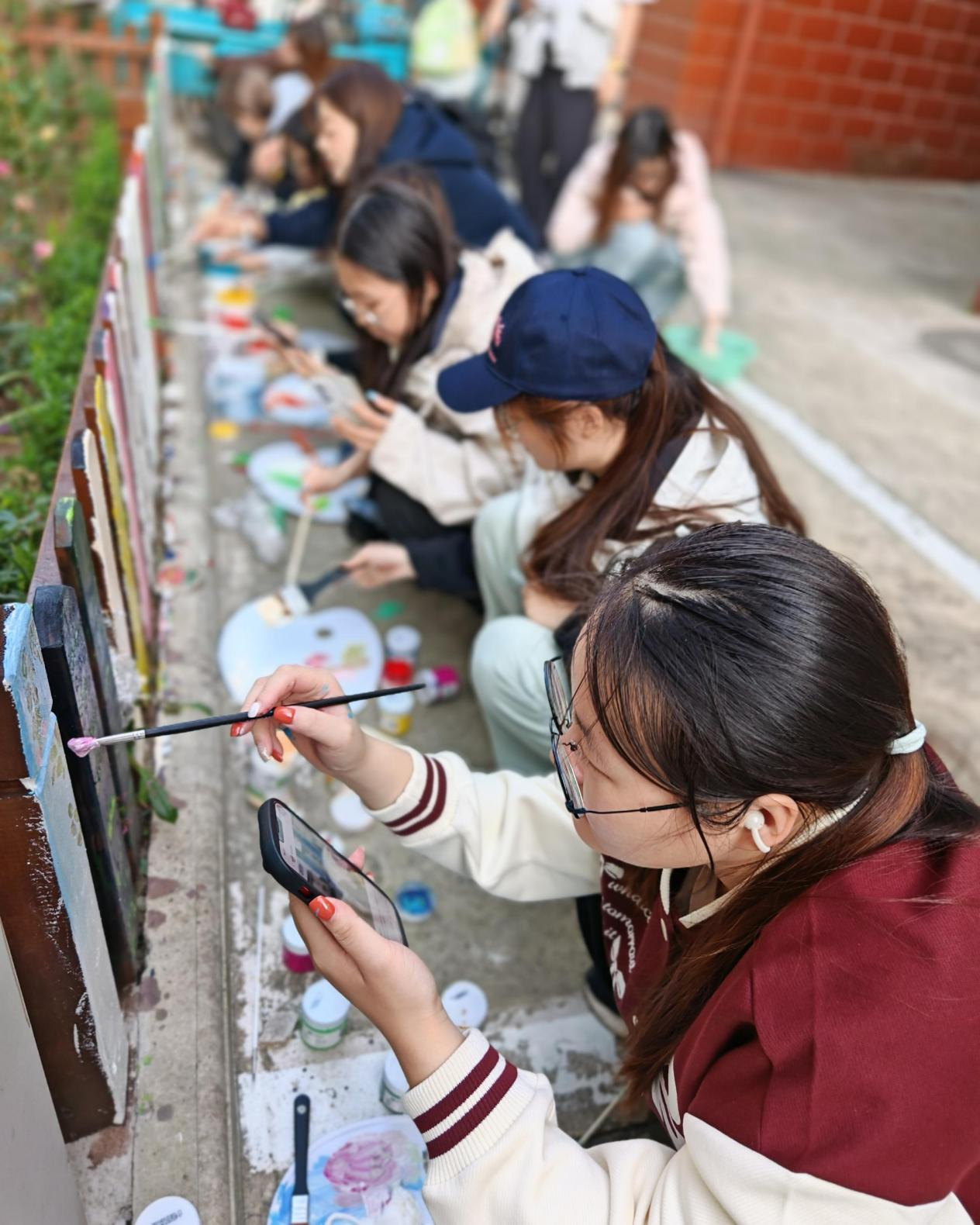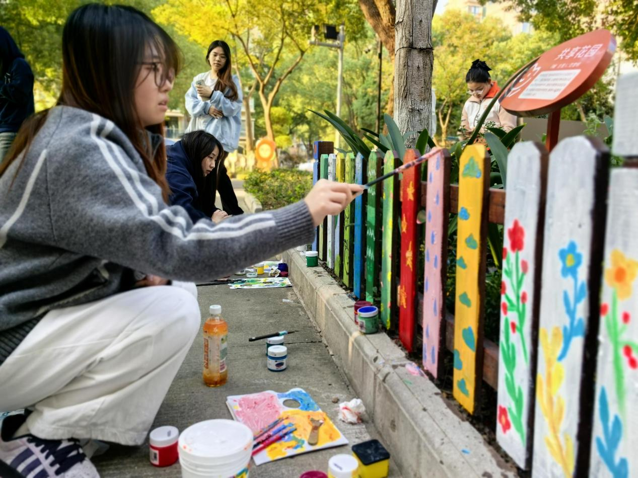 活动开展前,艺术设计学院师生深入社区开展设计调研,结合社区“睦邻友好、生态宜居”的建设理念,确定了“自然童趣”“文明新风”“邻里和睦”三大主题创作方向——花园栅栏采用清新明快的植物藤蔓、卡通形象设计,既呼应社区绿化环境,又增添活泼气息;居民楼墙面则通过具象化的文明标语、生活化的邻里场景绘画,传递正能量价值观。实践现场,同学们分工协作、热情高涨。有的手持卷尺测量尺寸、勾勒轮廓,有的调配颜料、细致填色,有的蹲在栅栏旁精修细节。参与活动的2025级广告艺术设计专业学生李同学表示,这次实践让她深刻体会到艺术设计不仅是课堂上的理论与技巧,更是服务社会、传递美好的重要载体。社区负责人对活动成效也给予高度评价:“同学们的作品既美观又接地气,不仅改善了社区环境,更营造了浓厚的文化氛围,为社区治理注入了青春活力。”