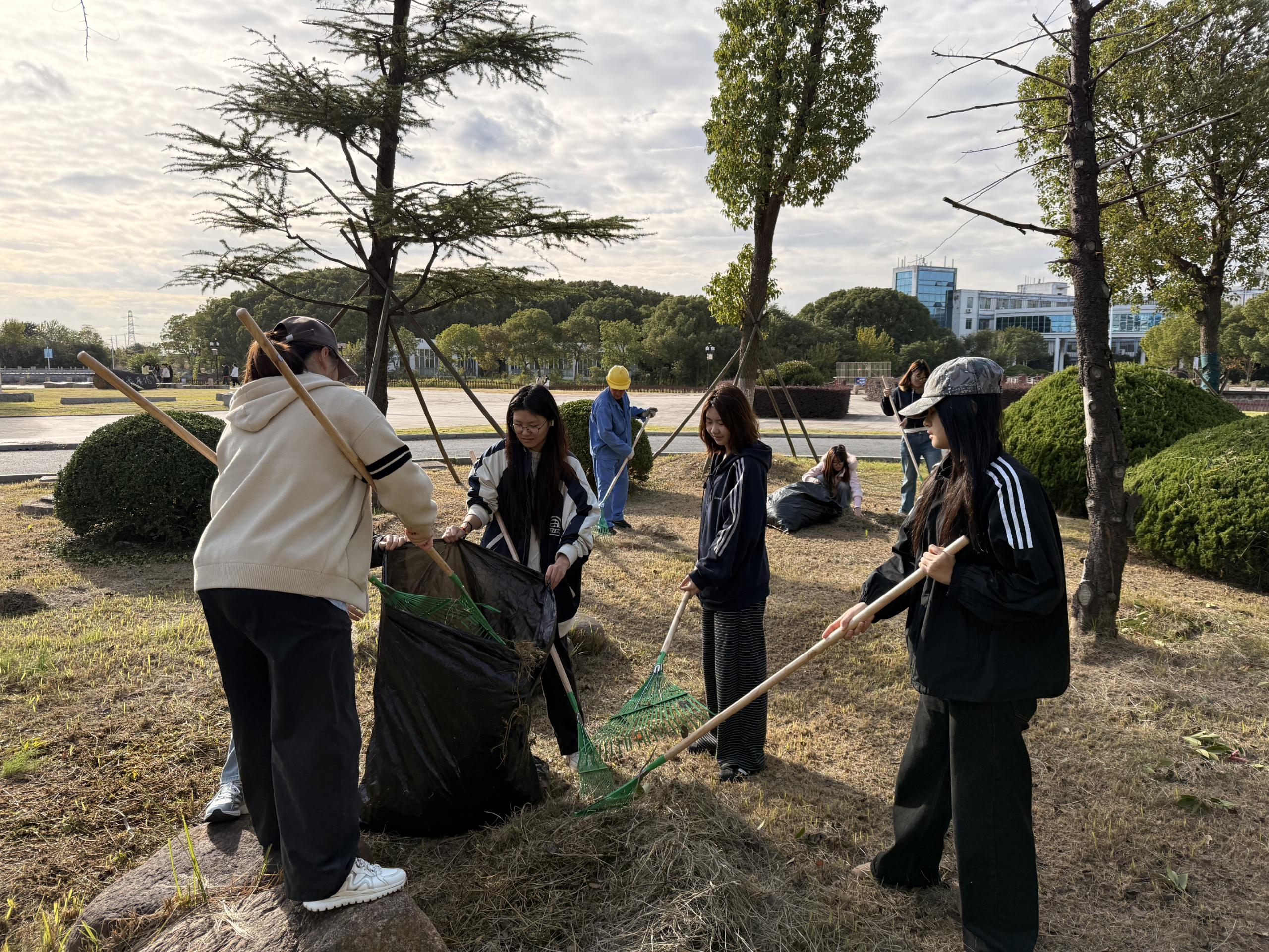 在校园主干道与绿化区域,保洁师傅们向同学们讲解示范清扫要点,同学们认真学习,分工协作,面对角落堆积的落叶,大家不嫌脏、不怕累,用双手清理出干净整洁的通道,让校园在秋冬交替之际依然保持清爽面貌。