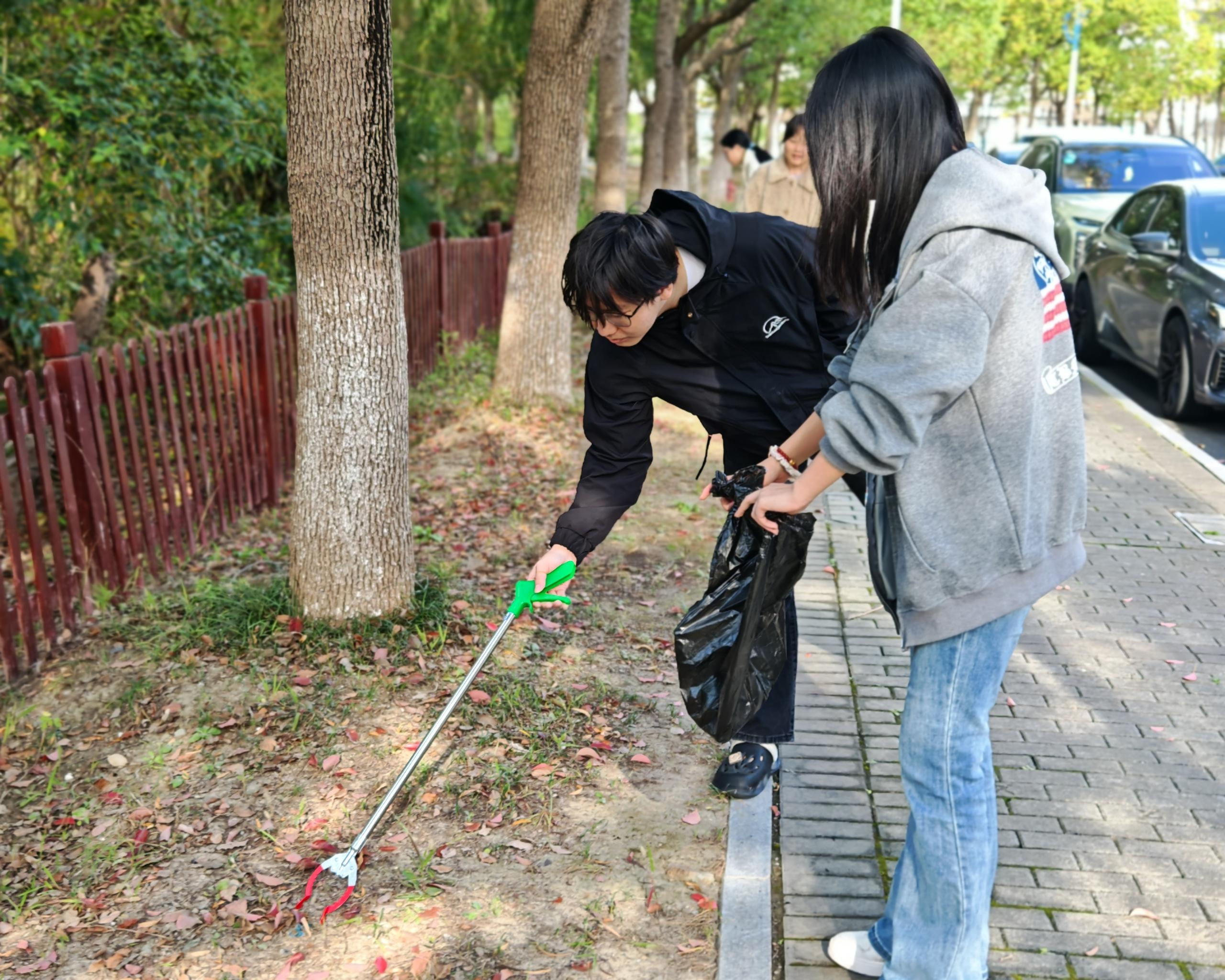 烟头拾取组的同学们手持垃圾夹,沿着校园小径、操场周边、花坛角落等区域细致巡查,逐一拾起散落的烟头与细小垃圾。参与活动的2024级广告艺术设计专业学生解志敏表示:“一个烟头虽小,却影响校园整体美观,也存在安全隐患。”