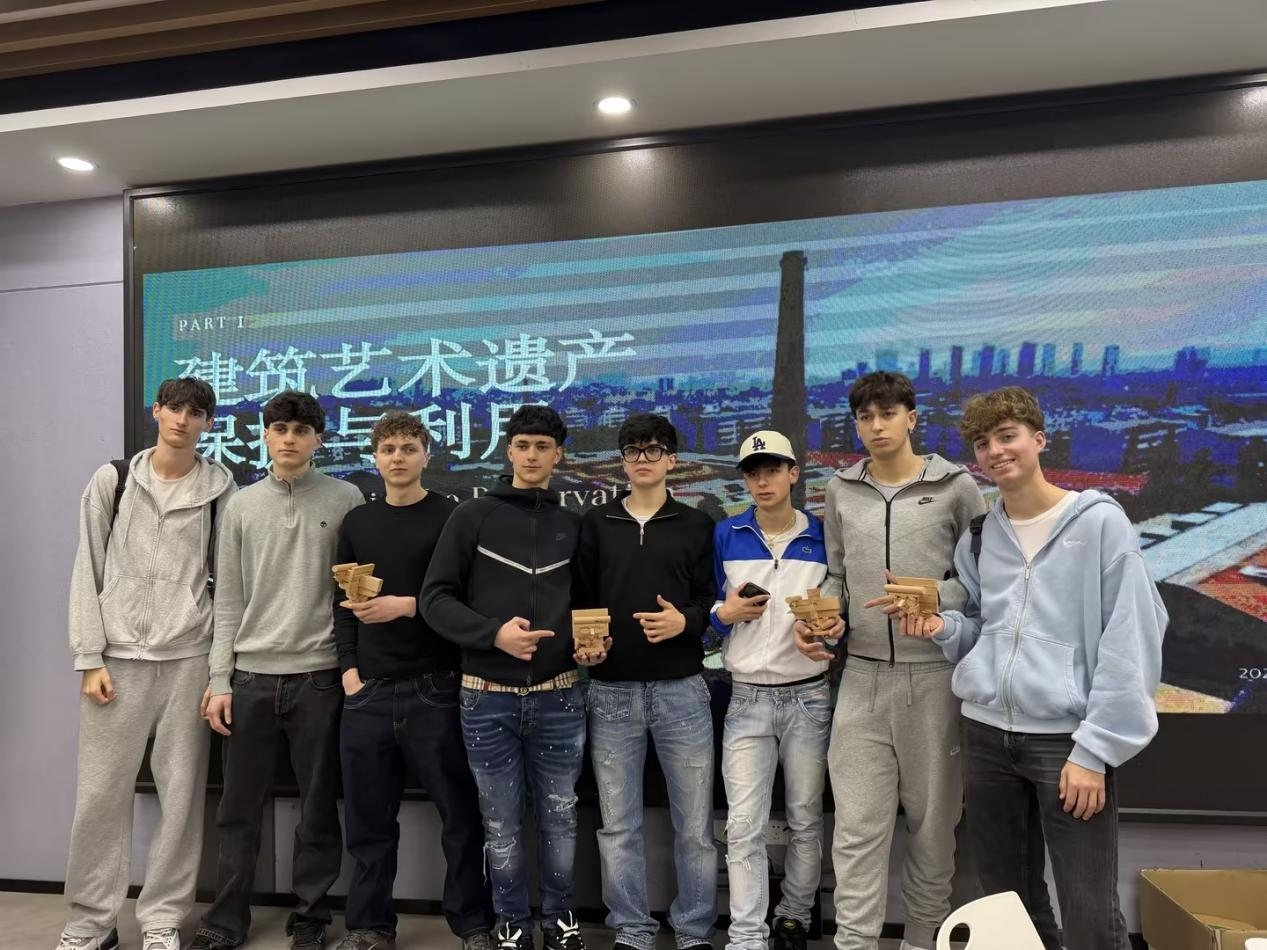 艺术设计学院沈敏老师以《建筑艺术遗产保护与利用》为题举办主题讲座,结合我院实际案例与前沿理念,从设计学视角阐释了建筑保护中的当代转化路径,引发意方师生的浓厚兴趣。在随后的工作坊环节,意大利留学生亲手体验了中国传统榫卯结构,通过拆解与组装,直观感受这一无钉无胶的构造智慧在空间与结构设计中的精妙之处。中意学生还围绕主题联合开展海报创作,在视觉语言、构图逻辑与设计表达上互鉴切磋,完成了一系列兼具文化交流与专业探索的作品。