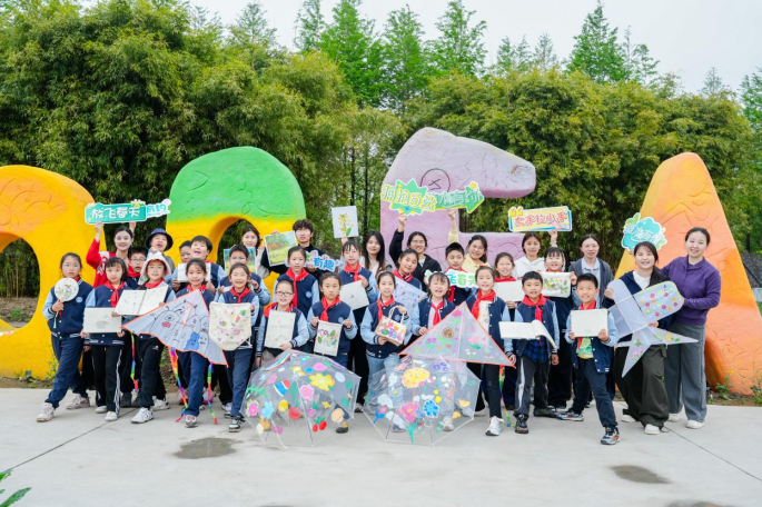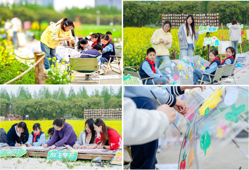春色明媚,正是绘色抒怀、放飞心绪的最佳时节。小朋友们秒变设计师,以透明伞、风筝为载体,尽情涂抹春天里的色彩。在大学生的启发与协助下,小朋友们大胆发挥想象,将春日繁花、翩跹蝶影、绚烂彩虹绘于伞面和风筝上,寄心中美好于绚丽的色彩,放飞春天。即兴的涂鸦和夸张的色彩搭配,是孩子们天性的释放,亦是一场源于自然的心灵疗愈。