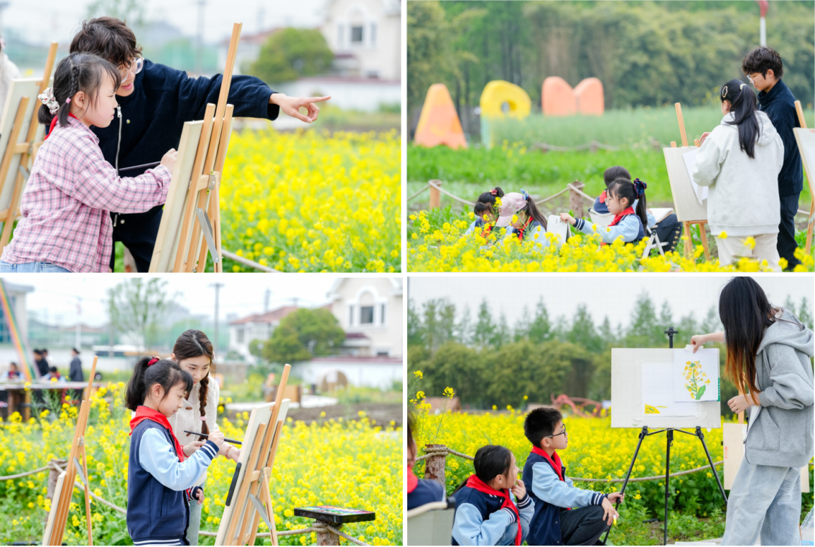 春风拂面,鲜亮的油菜花海成为春天里最动人的画卷。师生们漫步田野,大、小学生共绘春日美景。孩子们凝神观察,用画笔认真描绘花草的模样,表达春天的意象。童真、巧思、个性……都让创作者对春天的热爱溢满画幅。在与自然的亲密对视中,孩子们发现美、感知美、表现美,创造美,审美在此刻更加具象,灵感悄然在春风和花香间萌发与生长。