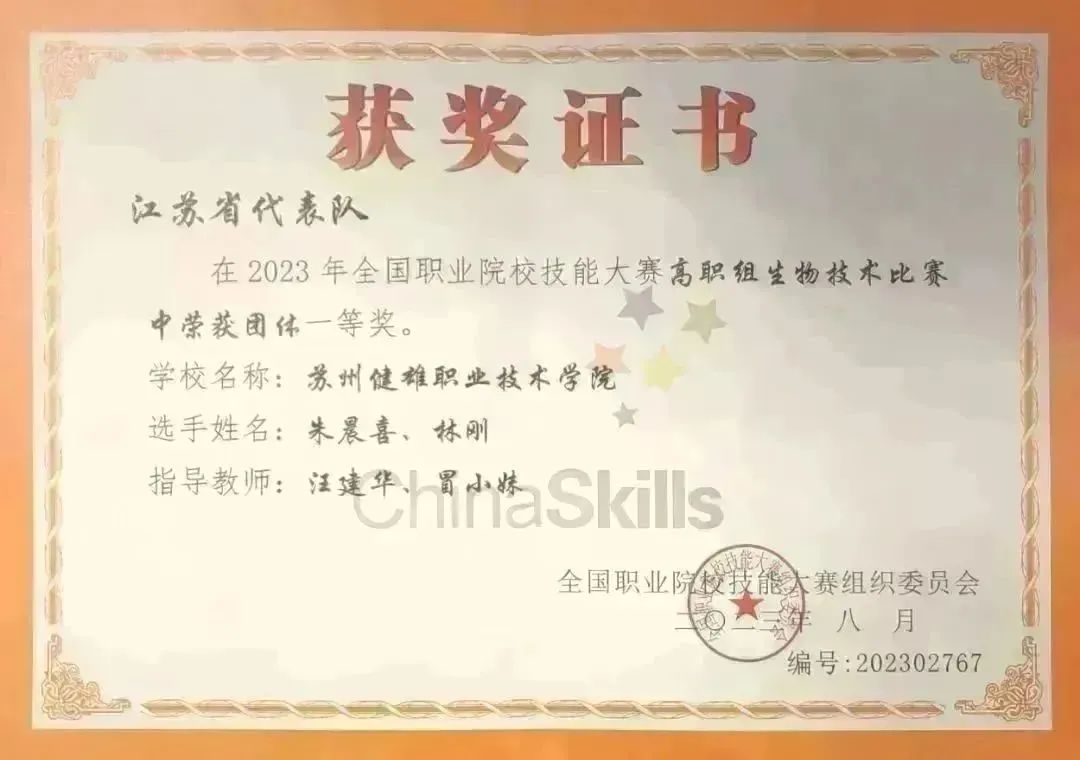 8月27日,2023年全国职业院校技能大赛高职组生物技术赛项在河北化工医药职业技术学院落下帷幕。本次比赛全国共有53支代表队参加,由我院生物医药学院学生朱晨喜、林刚组成的团队,代表江苏省参加比赛,经过紧张激烈的角逐,总成绩排名全国第二名,荣获2023 年全国职业院校技能大赛高职组生物技术赛项团体一等奖,实现我院近年来在学生技能大赛国赛成绩的新突破!