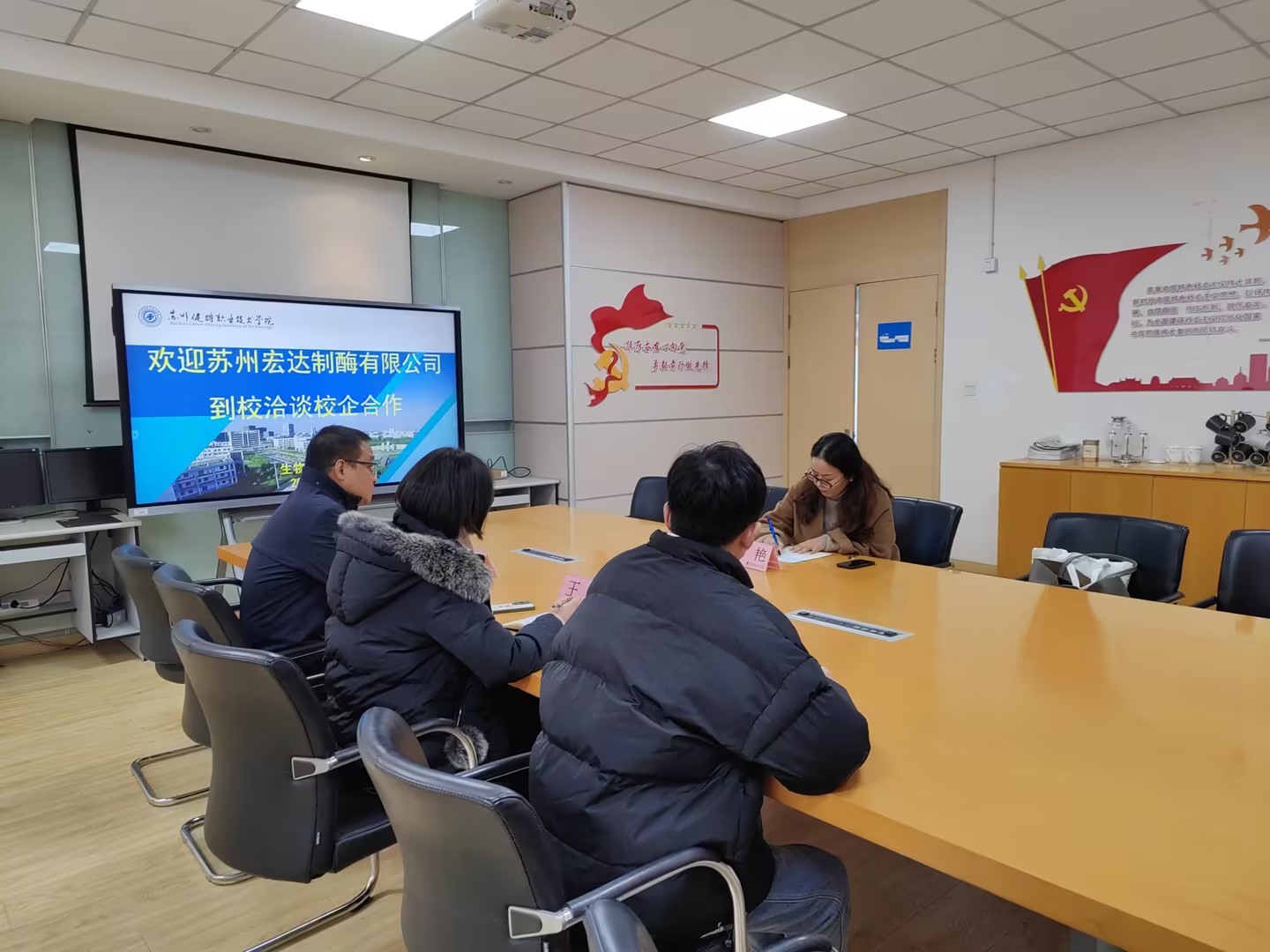 为了进一步深化校企合作,加强交流与互动,1月26日,苏州宏达制酶有限公司莅临生物医药学院洽谈校企合作。苏州宏达制酶有限公司人事总监吉艳、生物医药学院党总支副书记王玉、副院长程炜、毕业班辅导员刘豪杰参加洽谈会。