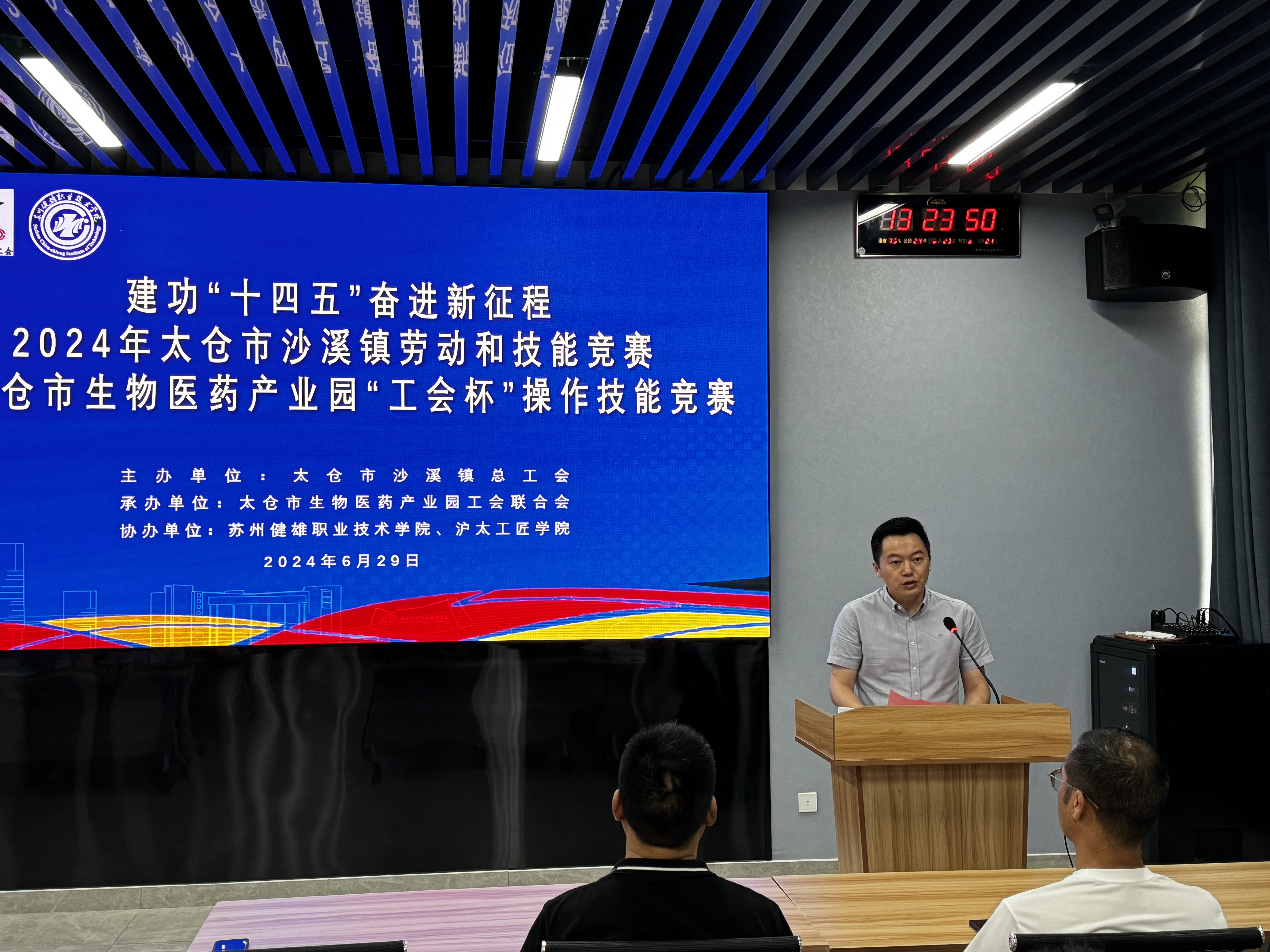 为认真贯彻落实党的二十大精神和习近平总书记系列重要讲话精神,大力弘扬劳模精神、劳动精神、工匠精神,推进产业工人队伍建设改革,充分发挥广大职工在推进高质量发展中的主力军作用,由太仓市沙溪镇总工会主办,太仓市生物医药产业园工会联合会承办,苏州健雄职业技术学院与沪太工匠学院协办的2024年 “建功‘十四五’奋进新征程”太仓市沙溪镇劳动和技能竞赛暨太仓市生物医药产业园“工会杯”操作技能竞赛于2024 年6 月 29 日下午在我院成功举办。