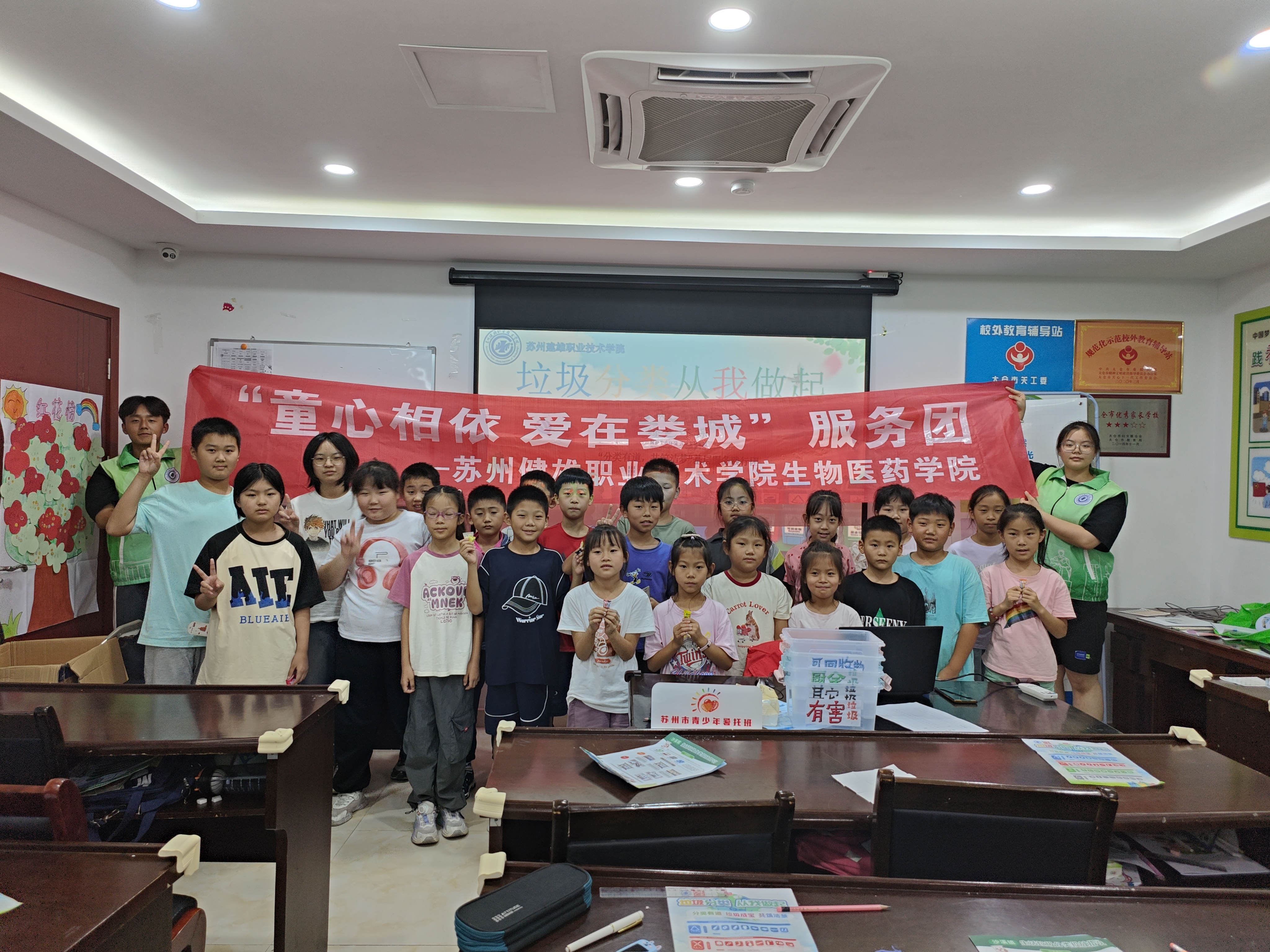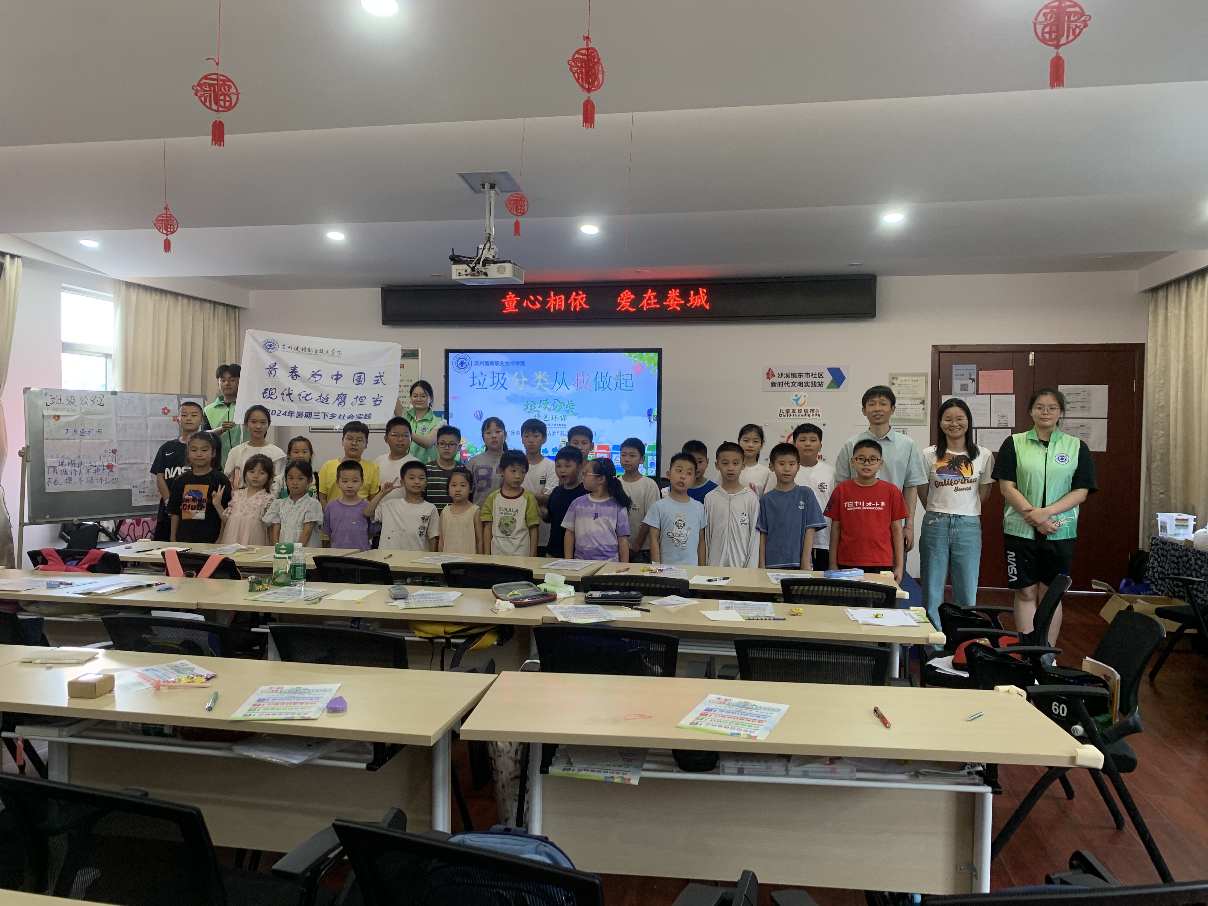 为积极响应国家生态文明建设号召,同时解决青年双职工家庭和困难家庭未成年子女暑期照护难题,暑期苏州健雄职业技术学院生物医药学院“童心相依 爱在娄城”志愿服务团携手太仓市“七彩夏日”青少年暑托班,走进太仓市沙溪镇东市社区、沙溪镇东归庄社区及娄东街道景瑞社区,开展“分类有道 共筑洁梦”垃圾分类主题活动。