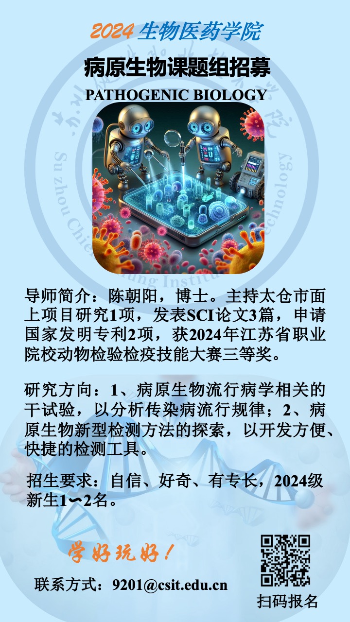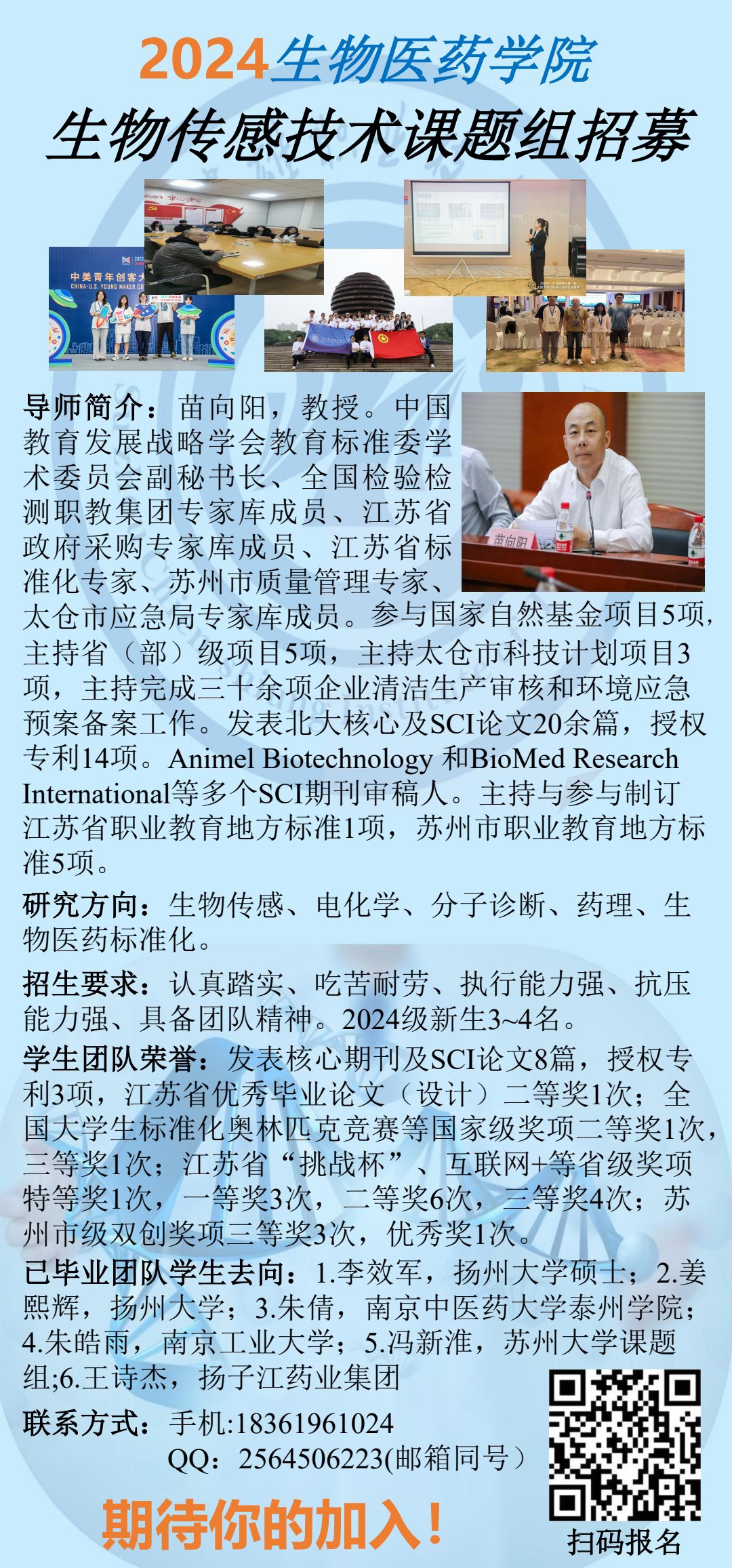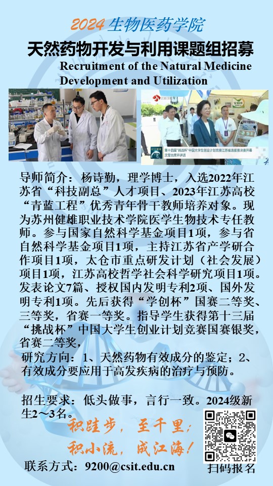 医学生物技术专业:天然药物开发与利用课题组(杨诗勤博士)、病原生物课题组(陈朝阳博士)、生物传感技术课题组(苗向阳博士)。