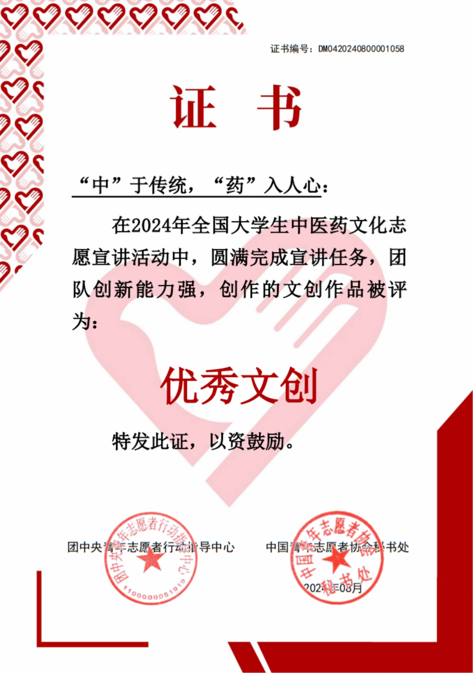 在近日揭晓的2024年全国大学生中医药文化精神志愿宣讲活动评选中,来自全国各地的中医药宣讲团凭借其出色的创意和深厚的文化底蕴,纷纷脱颖而出,我校生物医药学院“‘中’于传统,‘药’入人心”志愿宣讲团所创作的文创产品荣获“优秀文创”奖项。