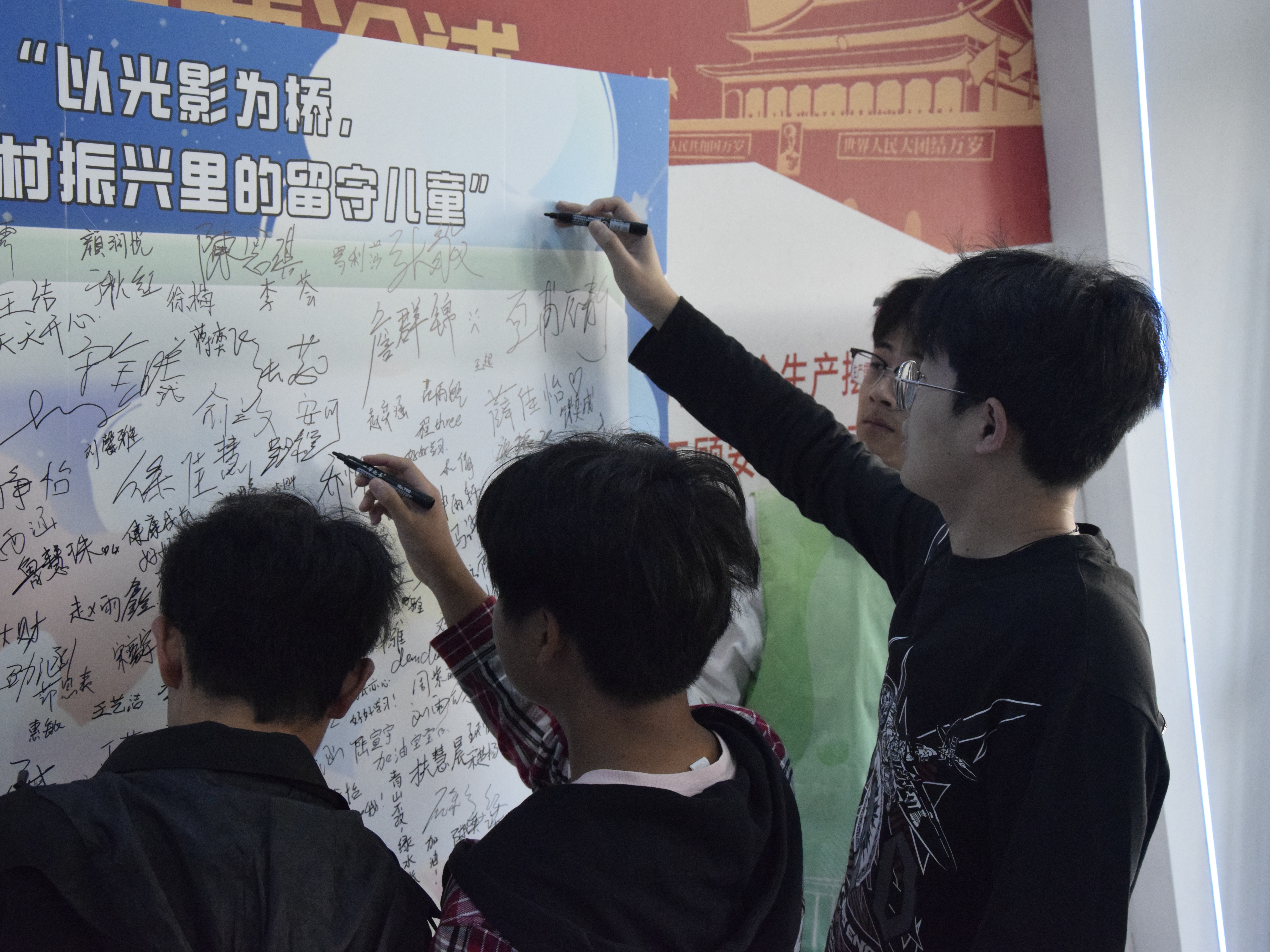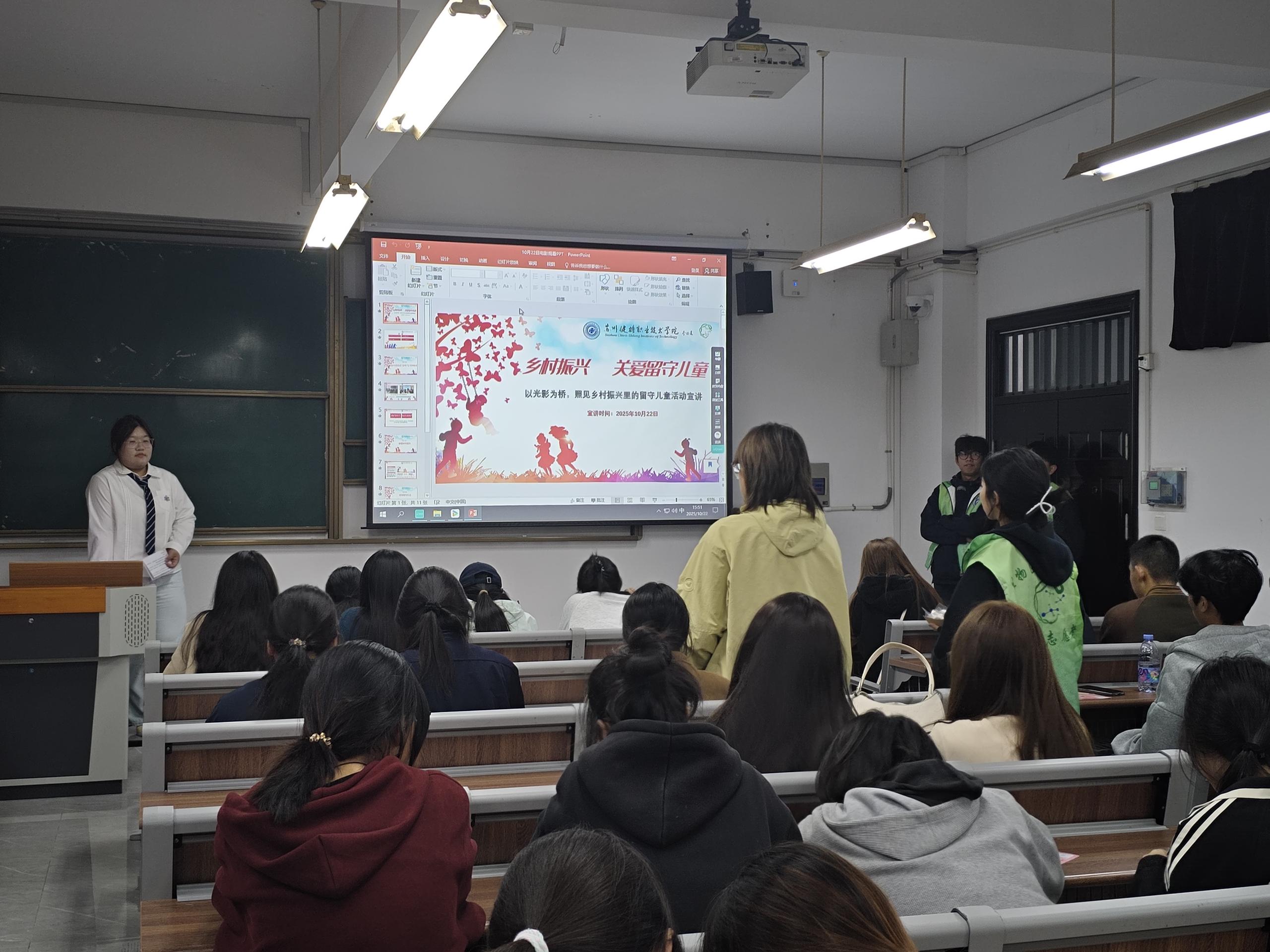 本次活动以“以光影为桥,照见乡村振兴里的留守儿童”为主题,创新设置观影分享、爱心签名、温情明信片书写等多元形式。活动现场,同学们在“关爱留守儿童,传递青春温情”签名墙上郑重落笔,用一笔一划传递对留守儿童的真挚善意;在明信片书写环节,大家以文字为载体,写下暖心寄语与成长祝福,寄托对乡村留守儿童的深切关怀。此外,通过观看留守儿童主题纪录片,同学们更直观地了解到留守儿童的生活现状与心灵需求,深刻共情他们的成长困境,进一步延续了暑期支教中与乡村孩子结下的情感联结。