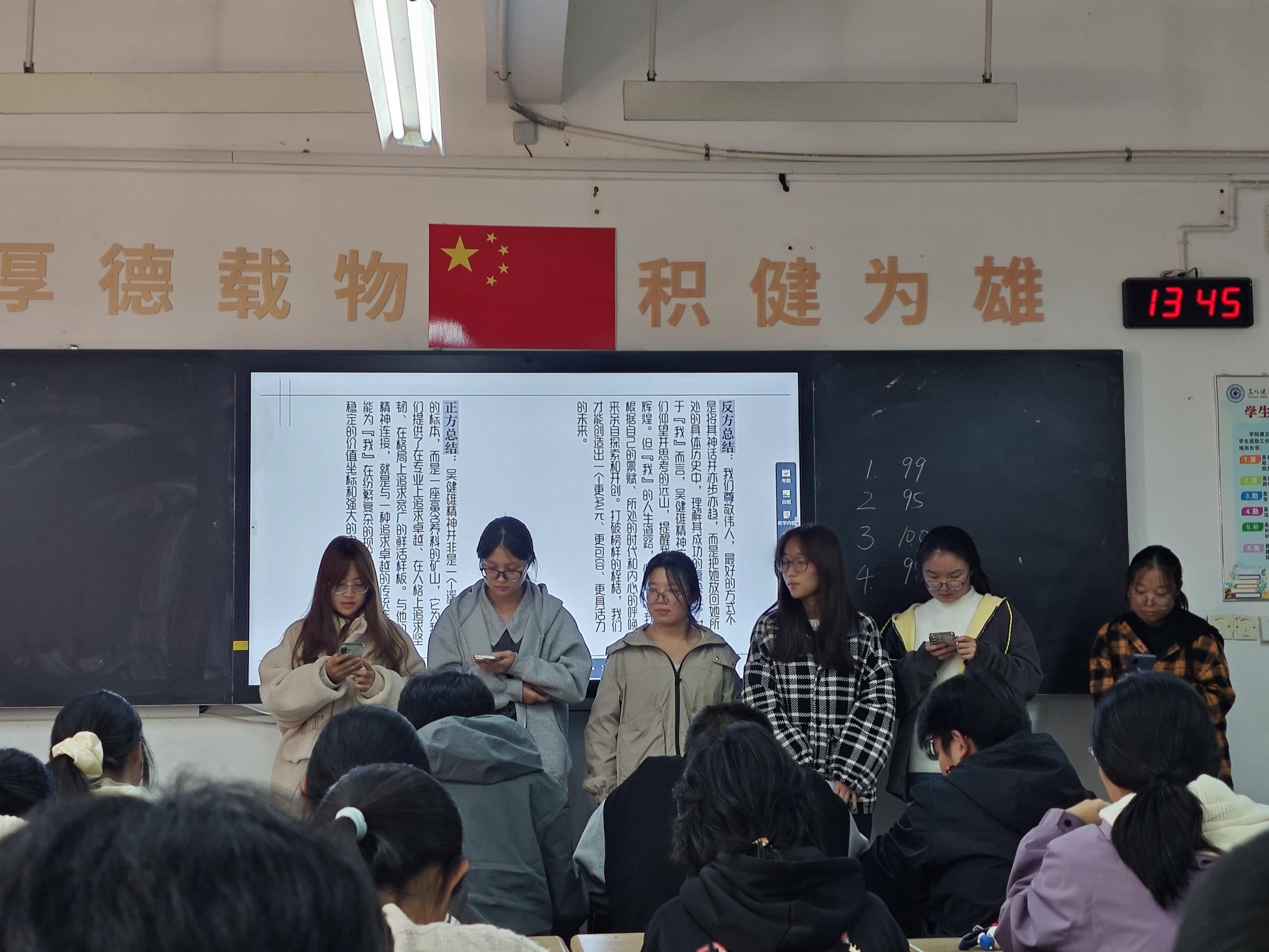 活动采用“示范授课+课后研讨”模式。班会以小组展示为主要形式,同学们通过小品、朗诵、知识问答等丰富多彩的表现形式,生动展现吴健雄的科学精神与人格魅力,既让学生体悟大家风范,也为新辅导员提供了鲜活教学范例。