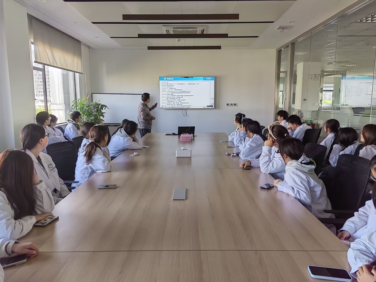 在依科赛公司负责人依总带领下,师生实地参观了企业生产一线。详细了解当前用于生物医药研发的关键试剂与耗材的生产流程、技术标准及质量控制体系。随后,负责人介绍了为学徒定制的在岗培训计划,并叮嘱学生们在校期间要夯实生物化学等专业基础,掌握扎实的实验技能,为后续企业轮岗实训做好充分准备。