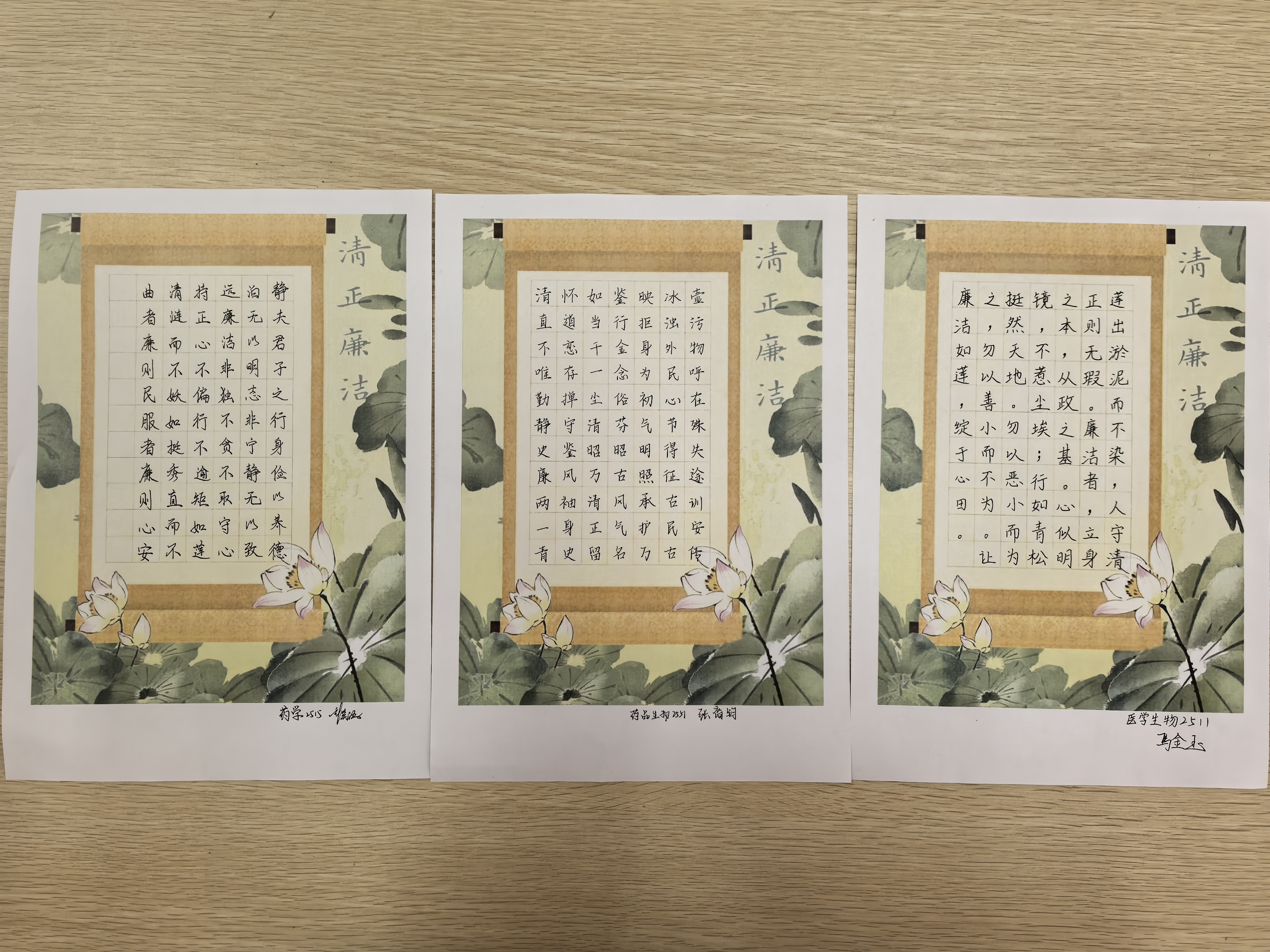 本次活动将美育与德育巧妙融合,以同学们喜闻乐见的形式,让廉洁种子在翰墨芬芳中悄然生根,为营造风清气正的校园文化环境注入了青春活力。(图文/王晓晴 审核/王玉 王志明)